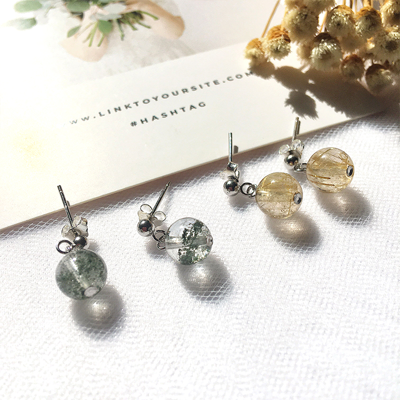 原创天然绿幽灵水晶耳钉S925纯银金发晶耳环简约时尚圆珠耳饰品女