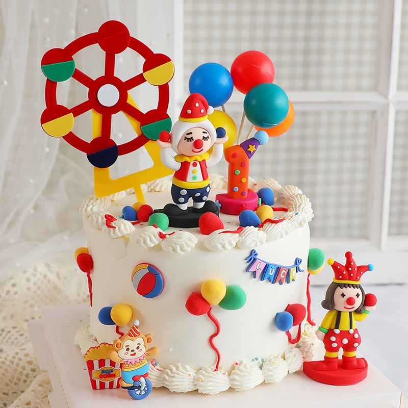 马戏团主题蛋糕装饰彩色小丑小动物软胶玩偶摆件儿童生日卡通插牌