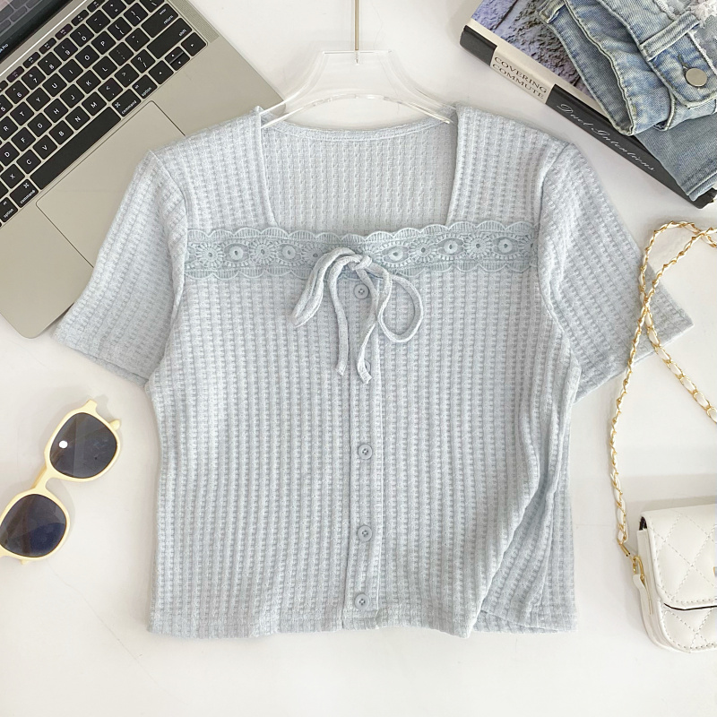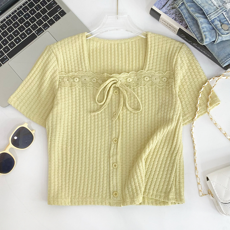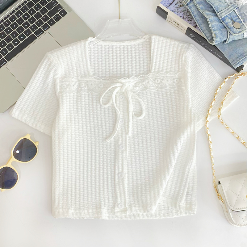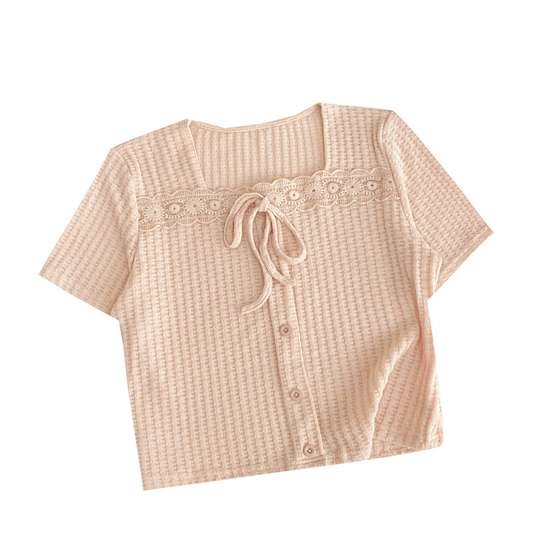 2025夏季新款甜美方领蕾丝花边短袖格纹蝴蝶结系带修身衬衫上衣女