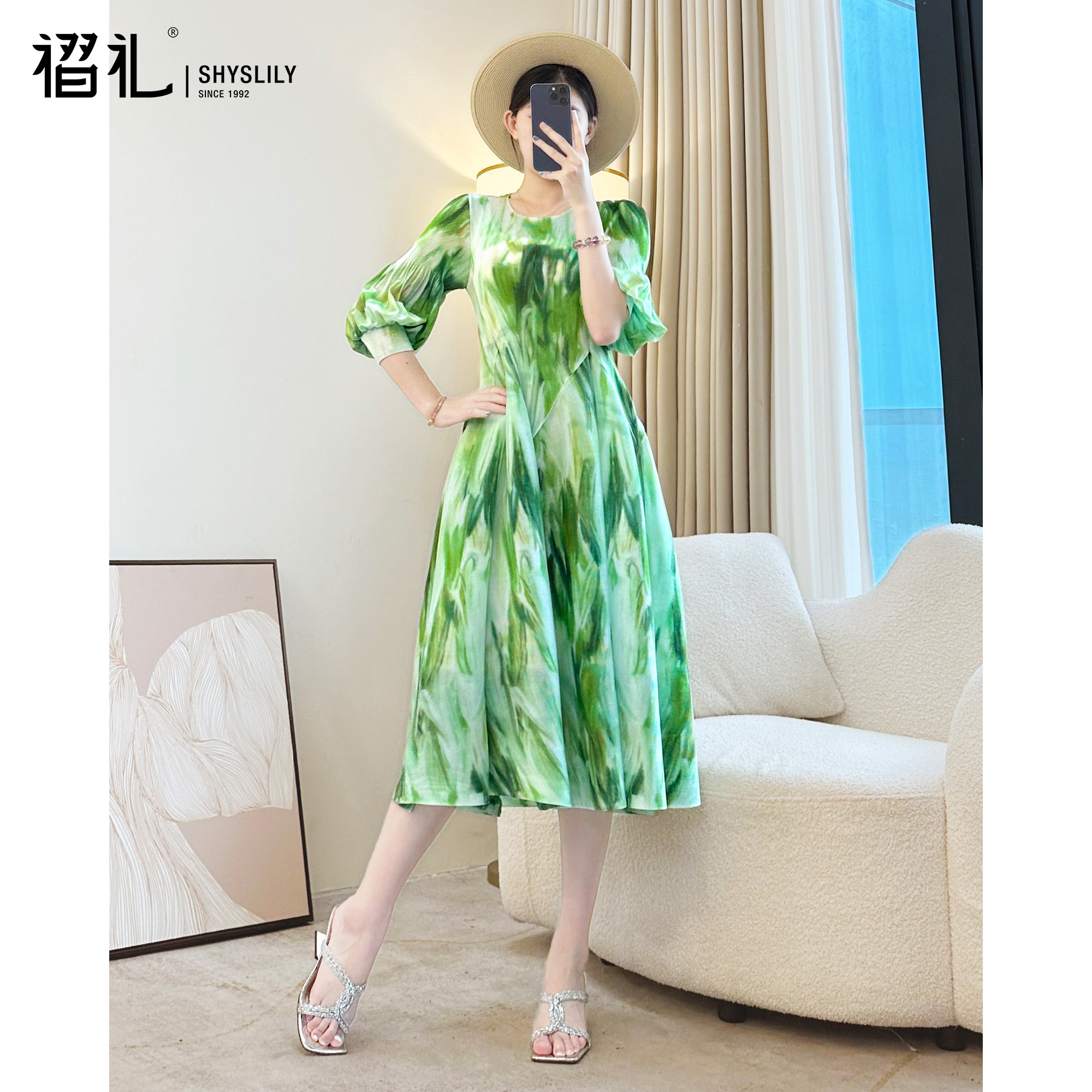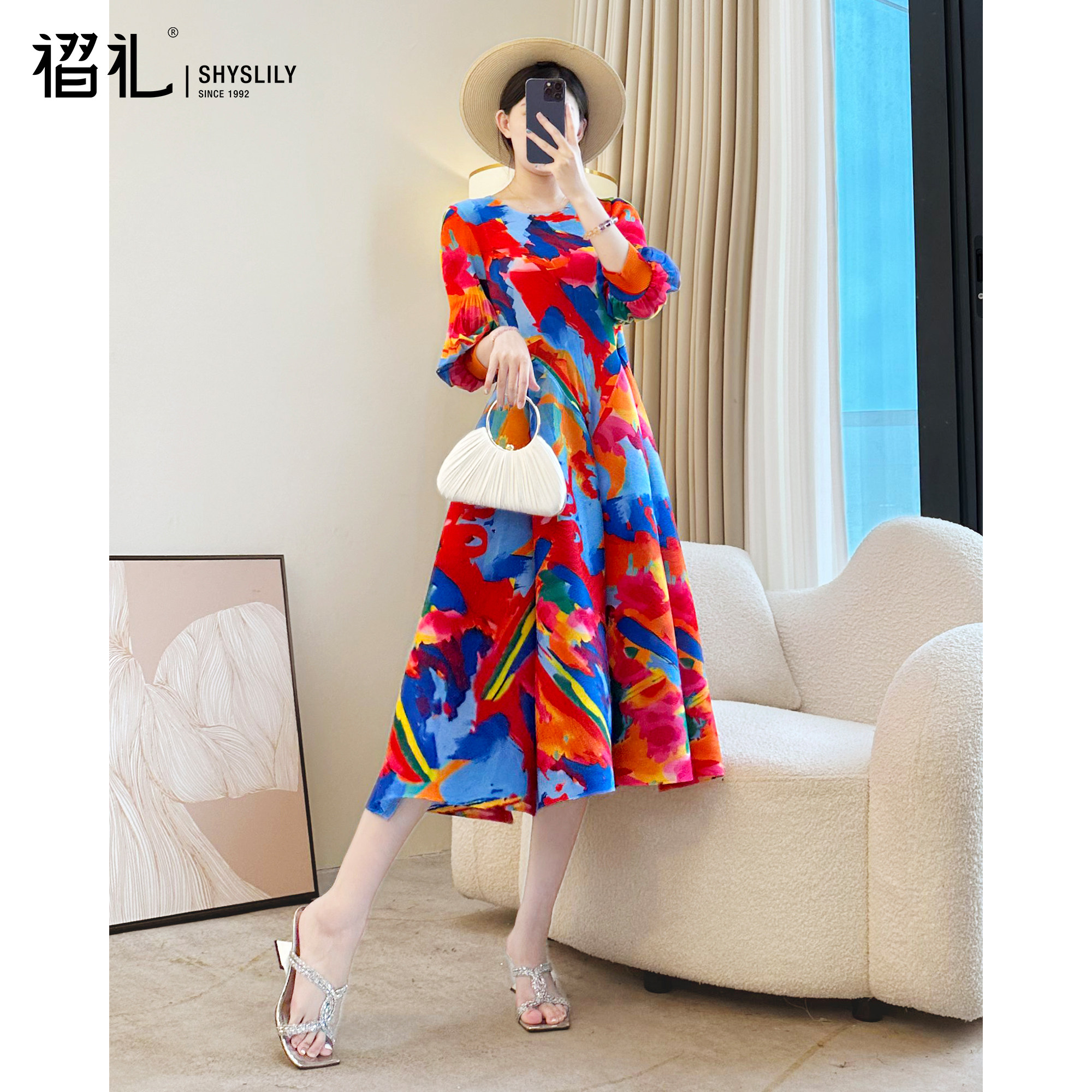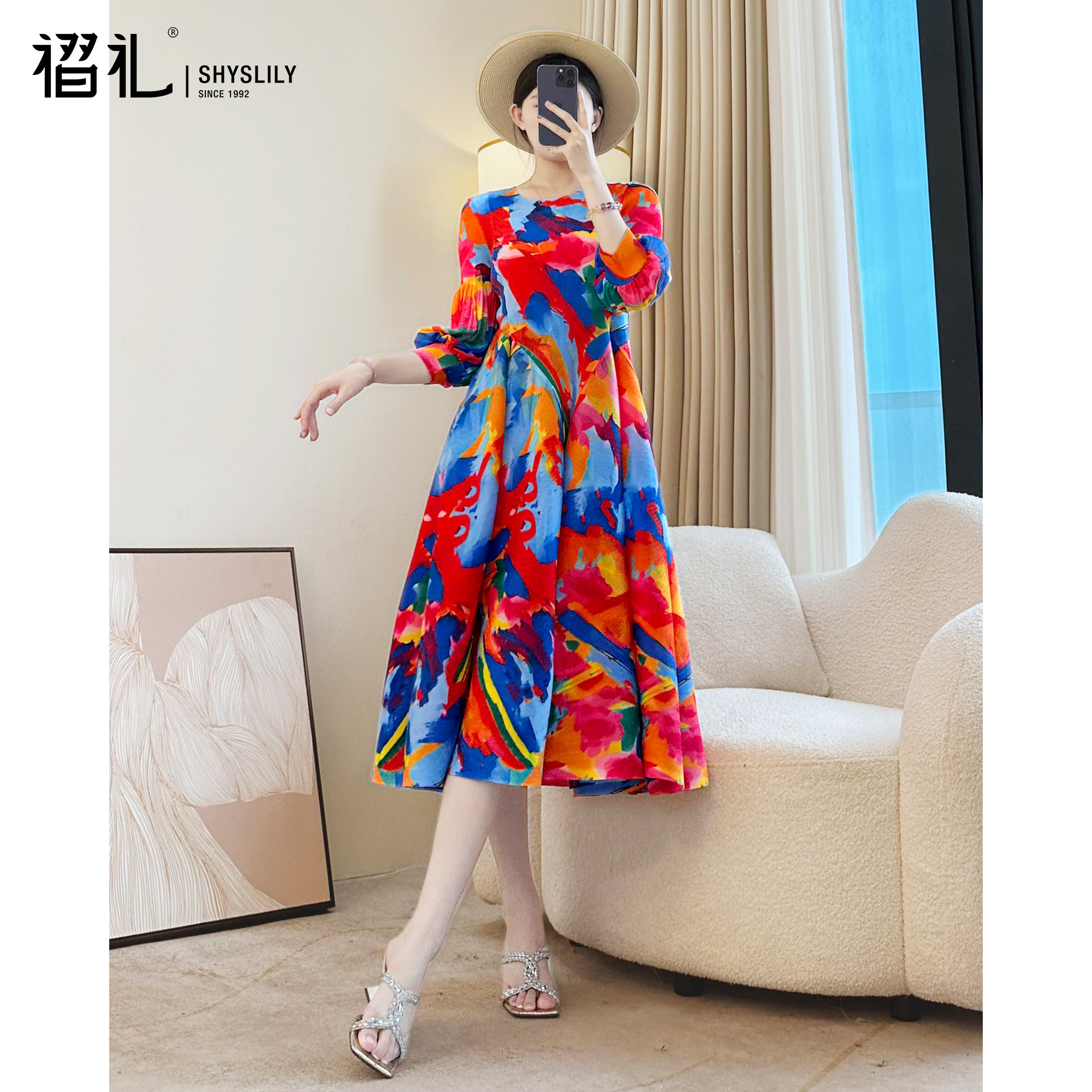 温柔风洋气褶皱连衣裙优雅印花长裙三宅弹簧裙大码花苞裙春季2026