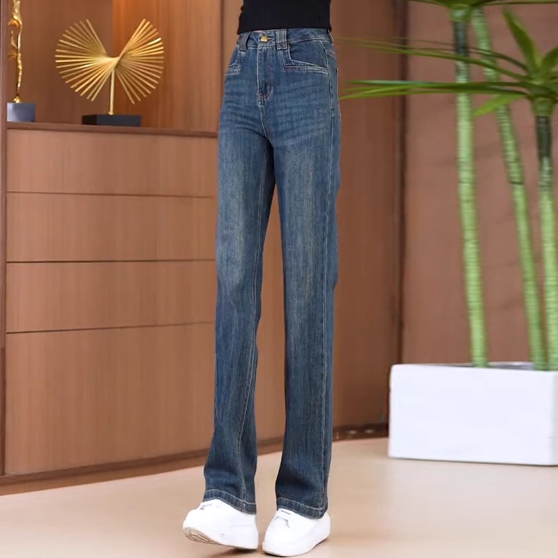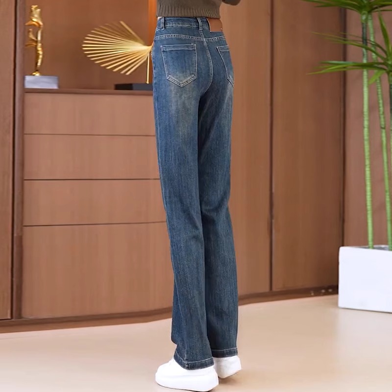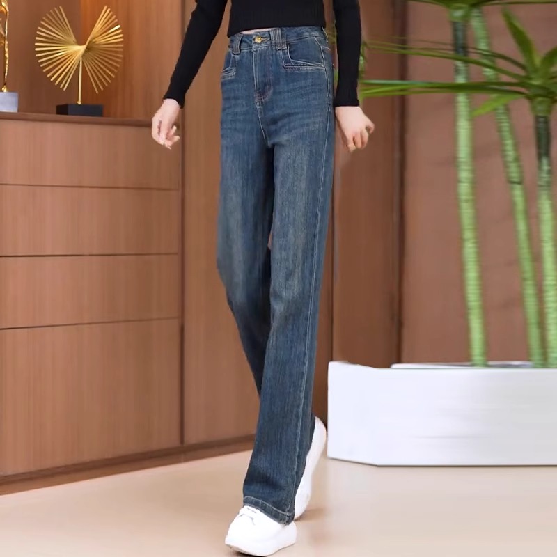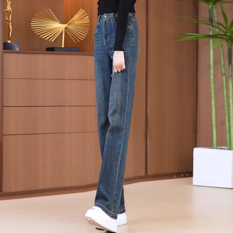 加绒窄版直筒牛仔裤女2025新款春秋季复古女裤子高腰宽松阔腿裤女