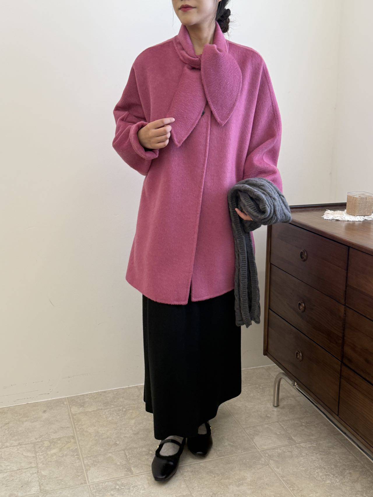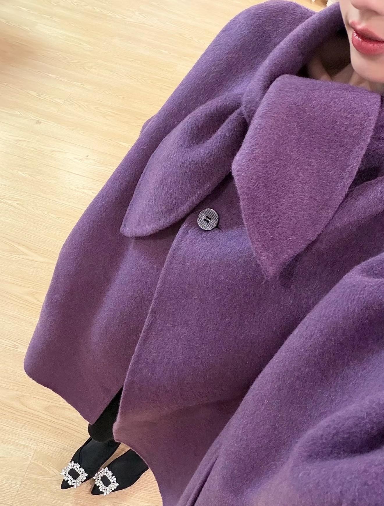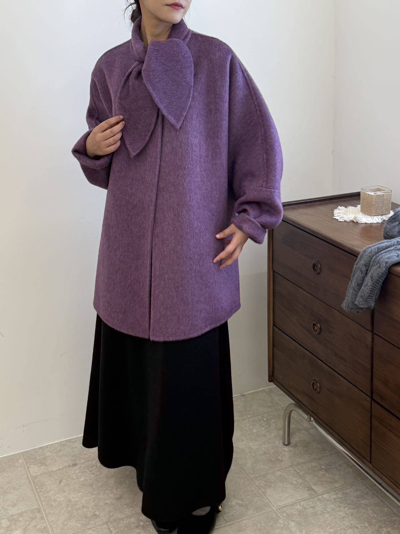2025新款双面羊毛大衣女中长款蝴蝶结领紫色山羊绒双面呢大衣外套