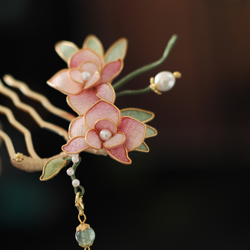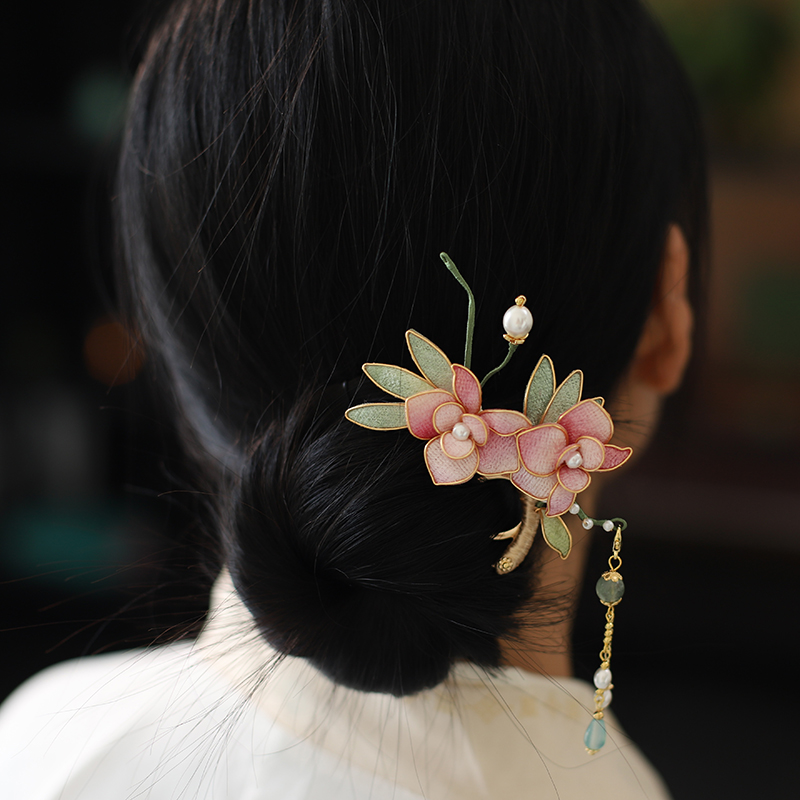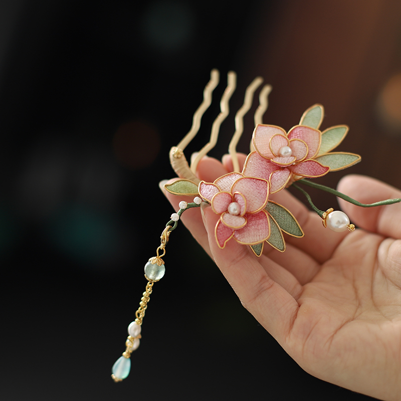 蝴蝶兰古风粉色配饰步摇发梳插梳后脑勺汉服旗袍发饰秀禾订婚头饰