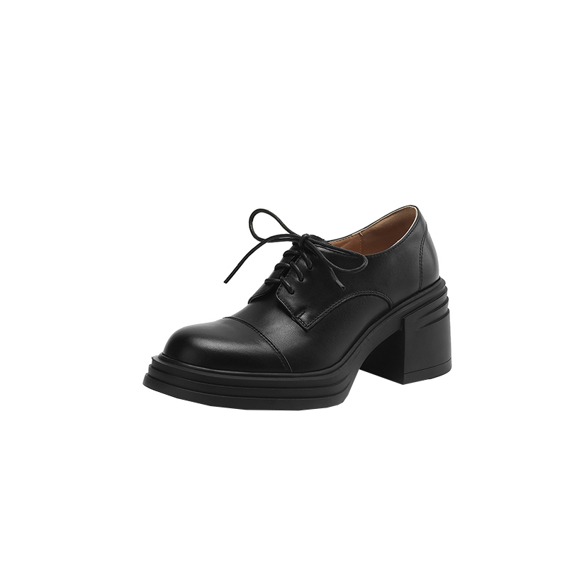 真皮高跟小皮鞋女2025新款春季粗跟黑色复古系带单鞋百搭通勤女鞋