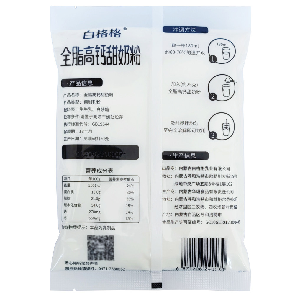 白格格全脂高钙甜奶粉全家营养