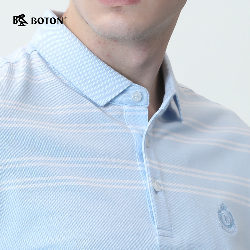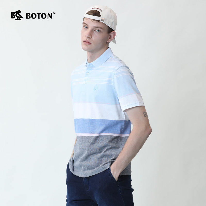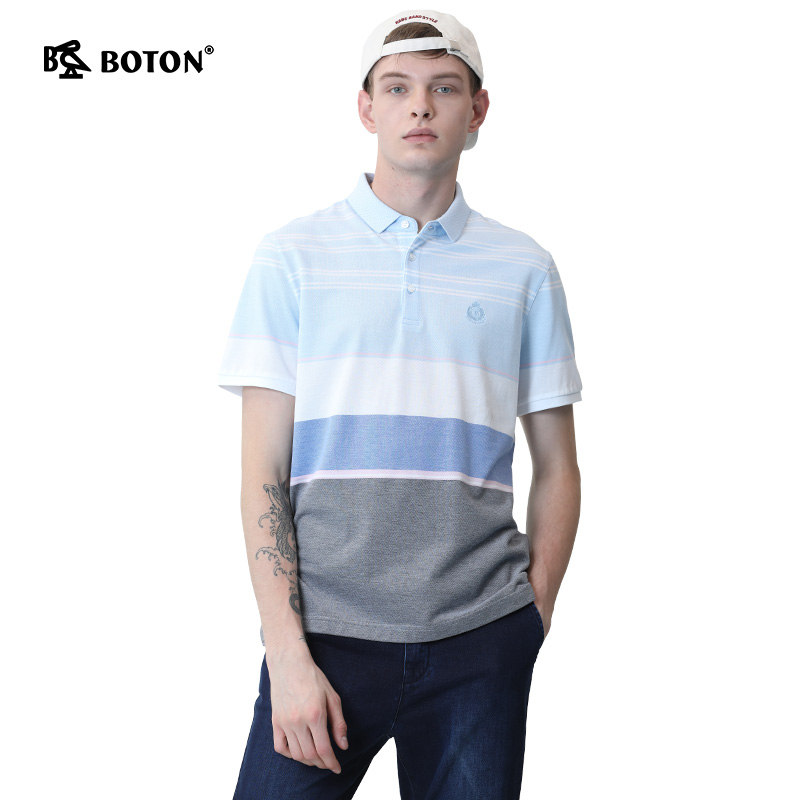 波顿男士时尚美式休闲翻领短袖浅蓝色保罗高端条纹Polo衫纯棉t恤