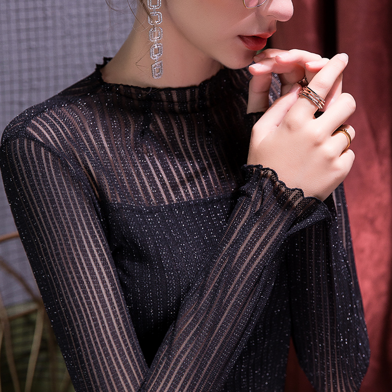 2025秋季新款半高领打底衫女蕾丝网纱性感欧洲站亮丝洋气女装小衫