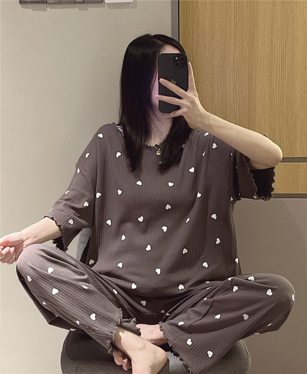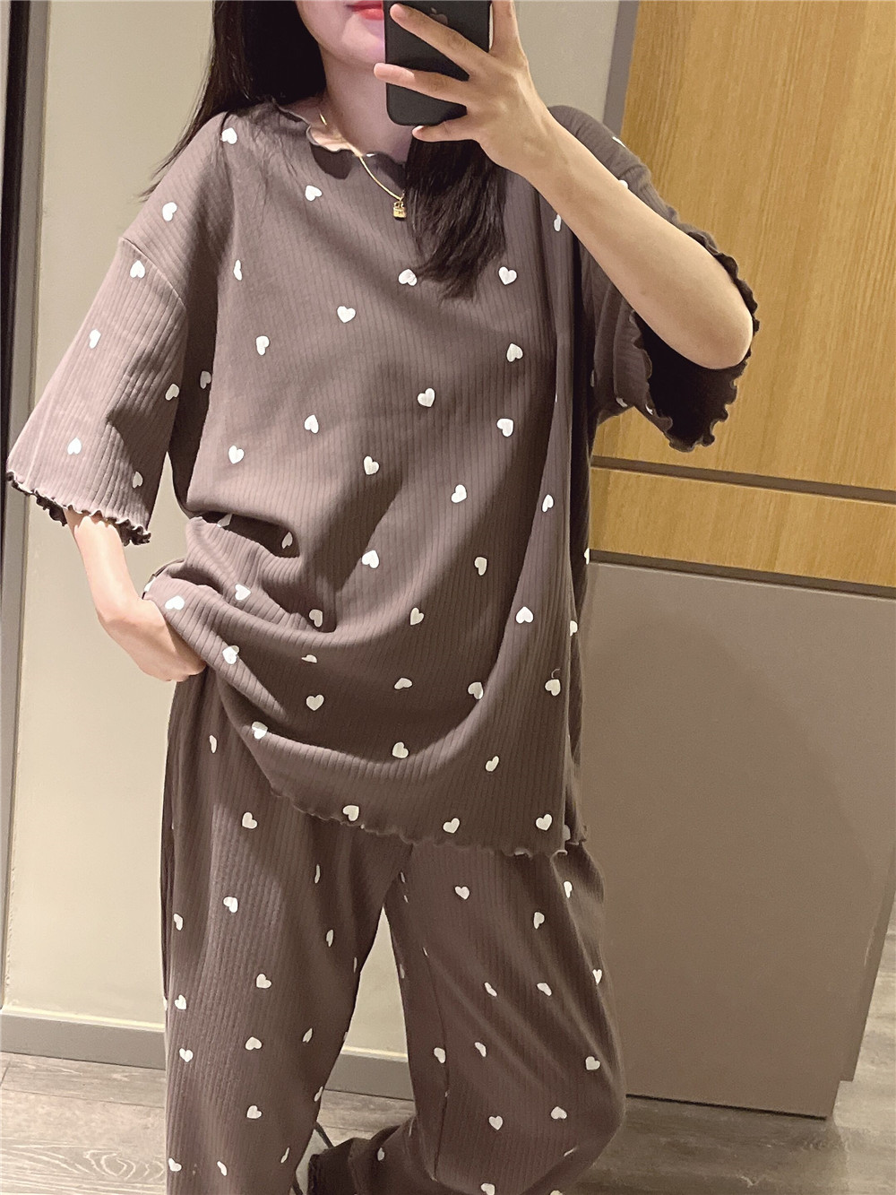 短袖睡衣女夏针织棉甜美爱心木耳边家居服大码胖mm200斤长裤套装