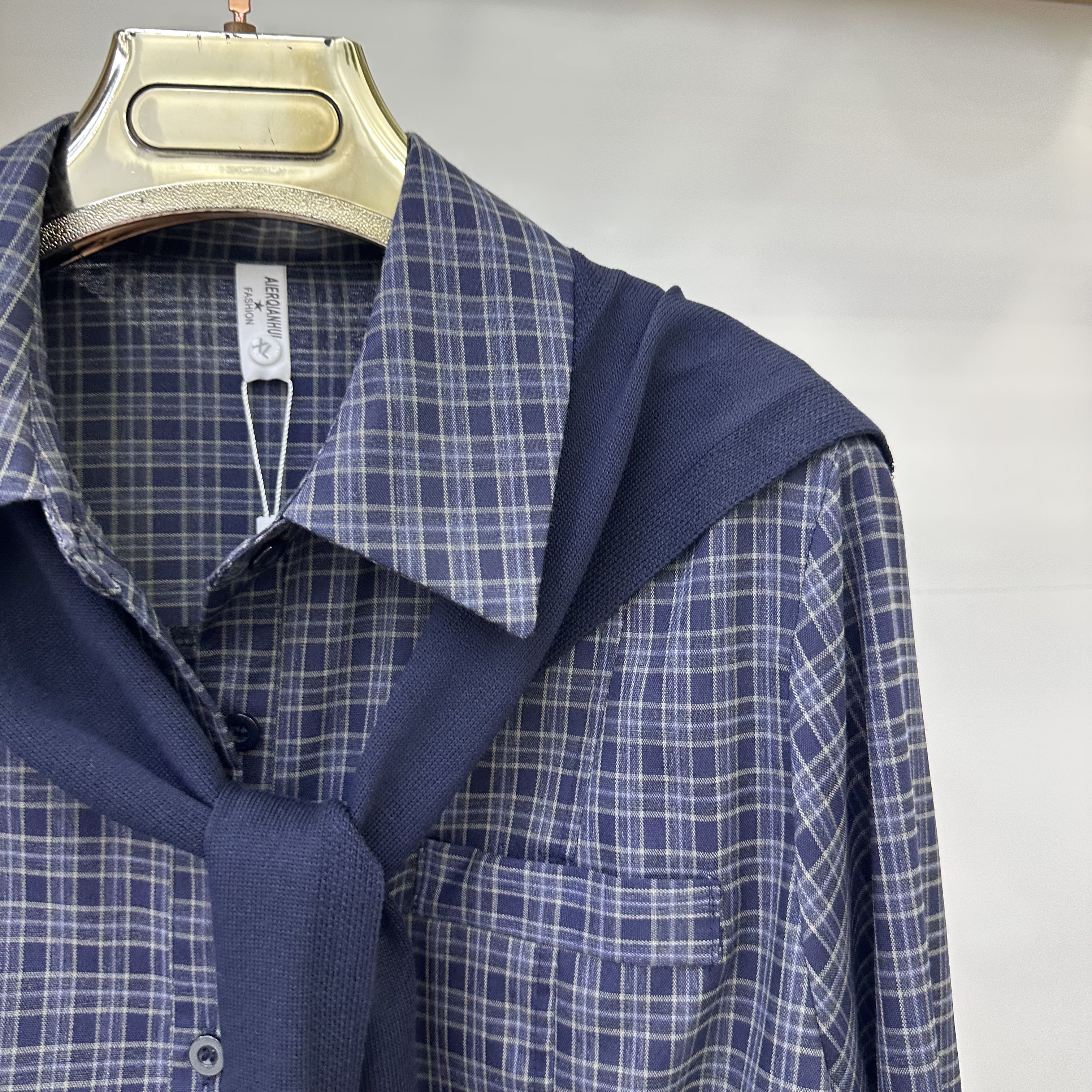 8825专柜正品新款秋季女装时尚短款长袖格子妈妈装打底衬衫带披肩