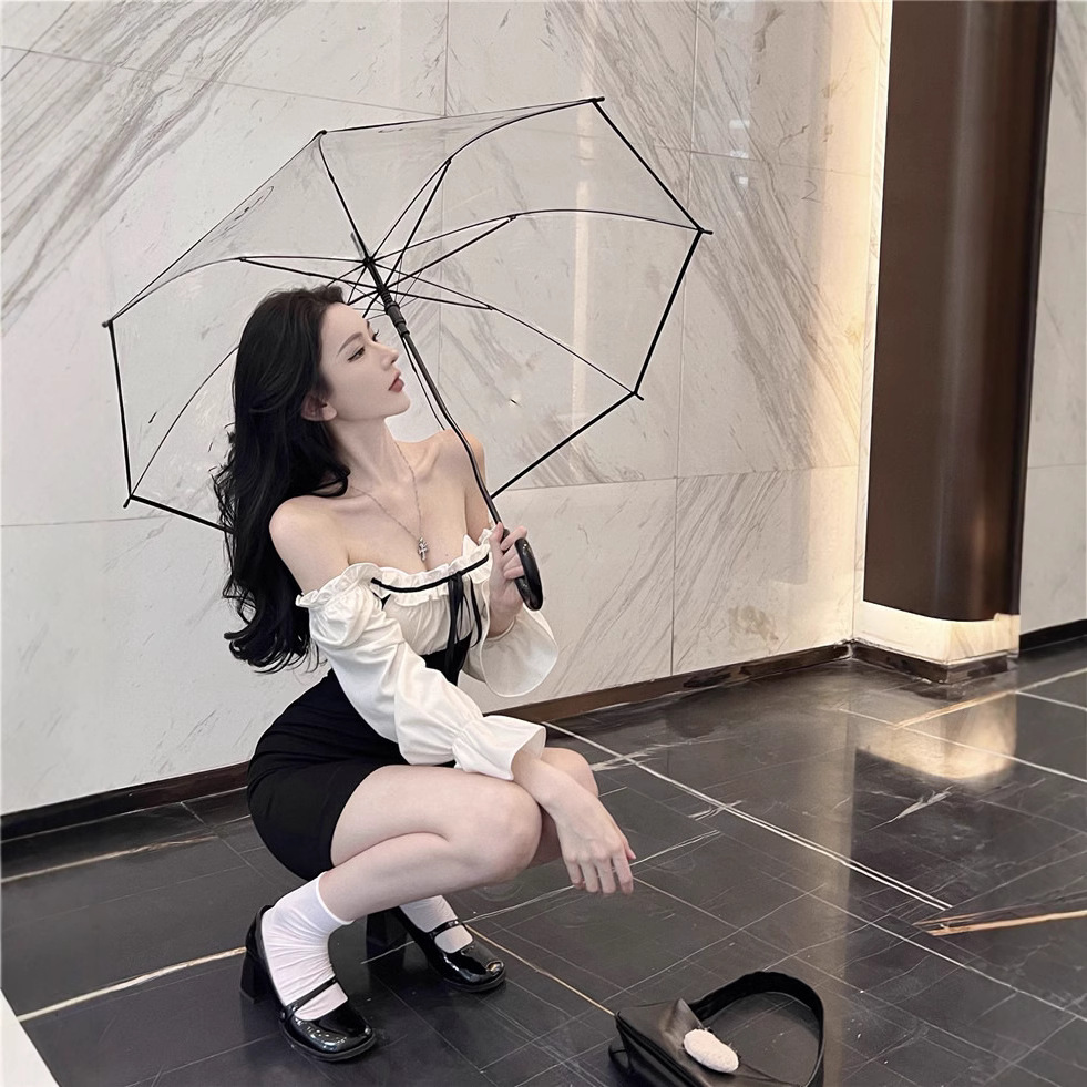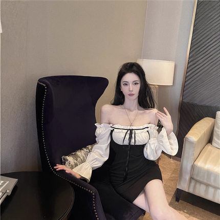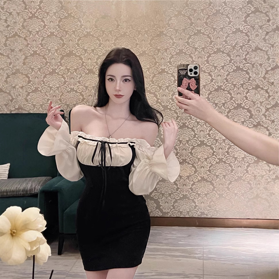 喇叭袖露肩性感连衣裙女秋冬辣妹纯欲风修身内搭假两件打底短