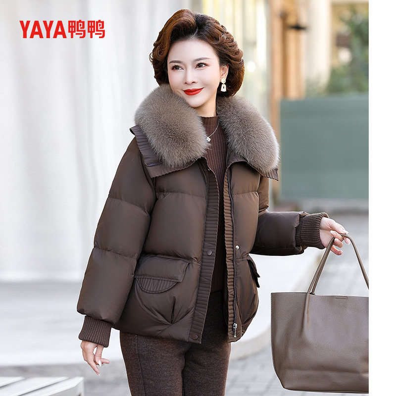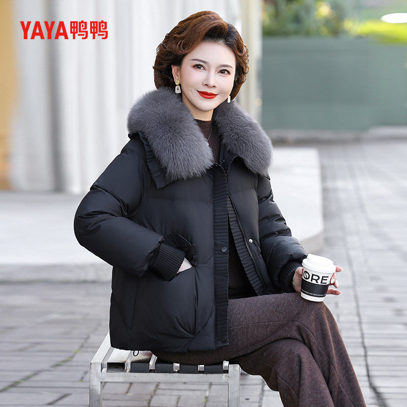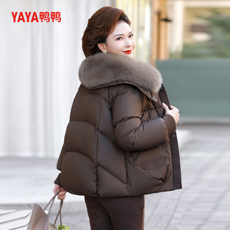 鸭鸭冬季款羽绒服女短款中年妈妈大狐狸毛领保暖冬装中老年人外套