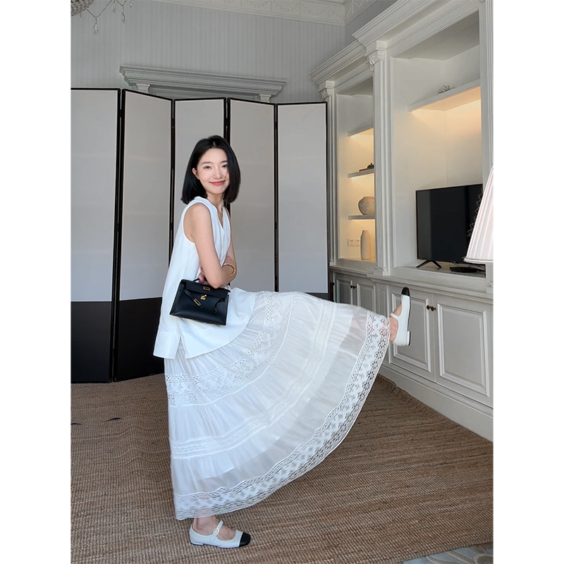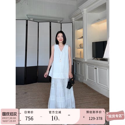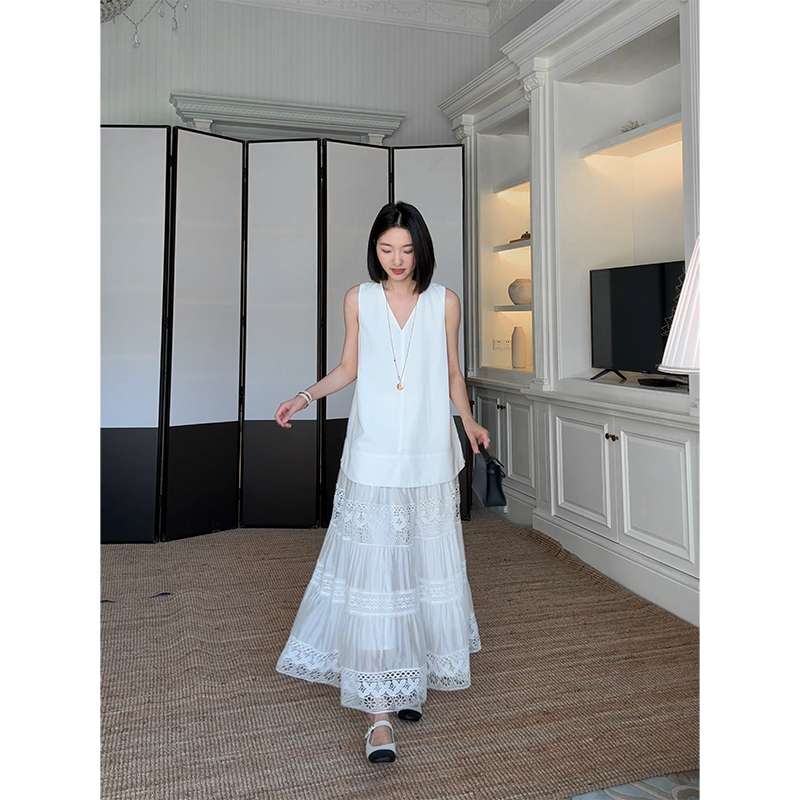 郭九九呢 天丝亚麻v领显瘦简约无袖上衣夏季百搭重工蕾丝半身裙