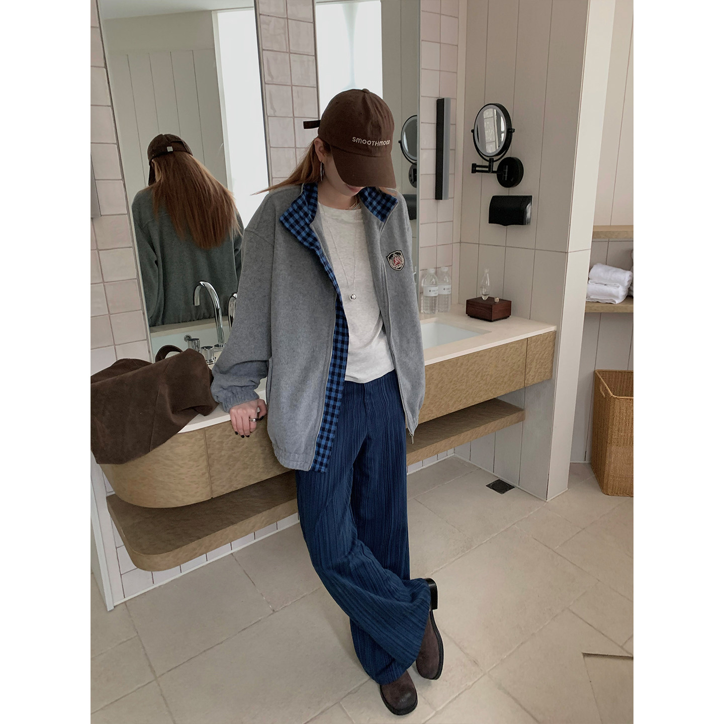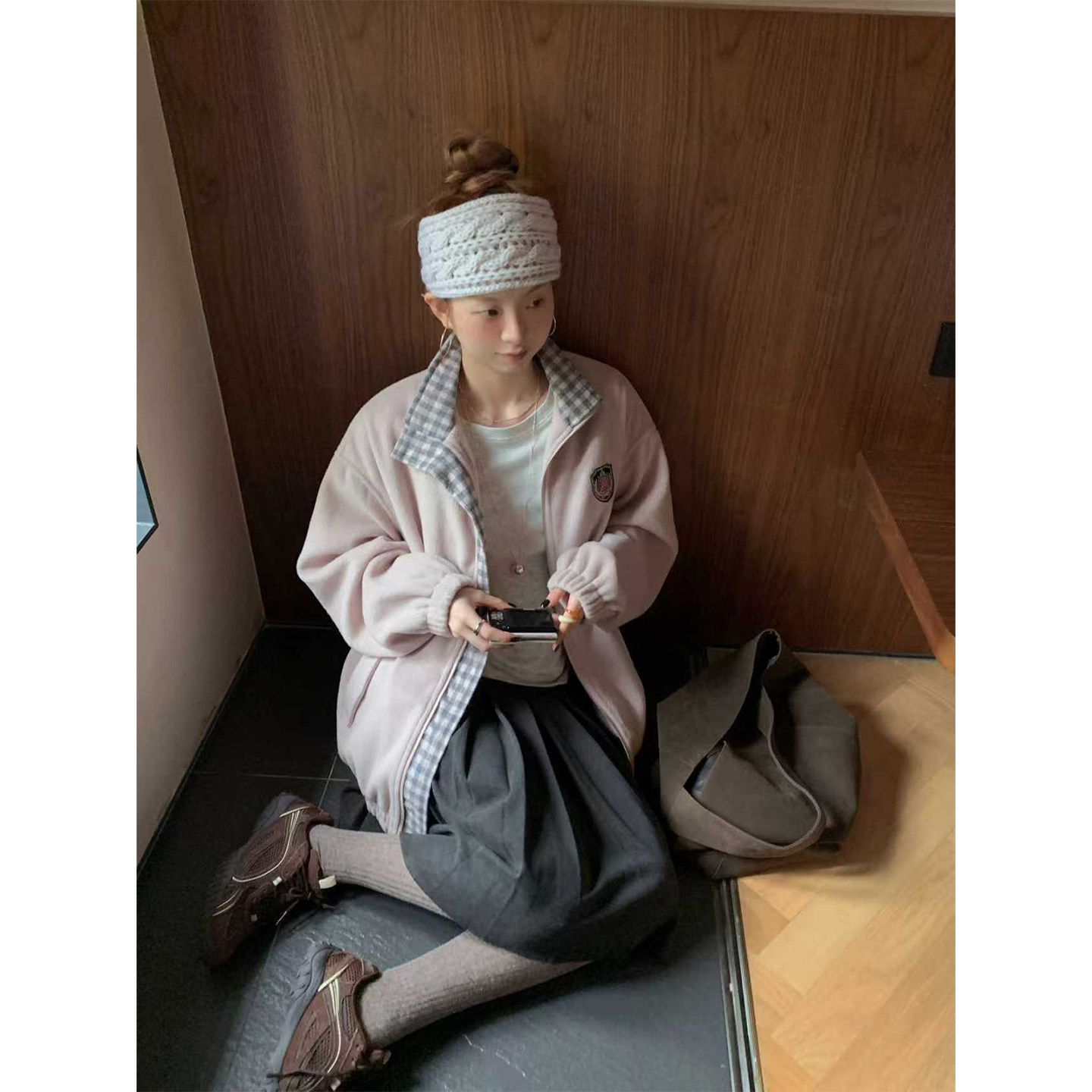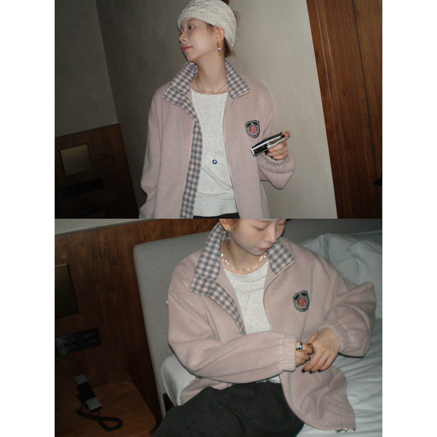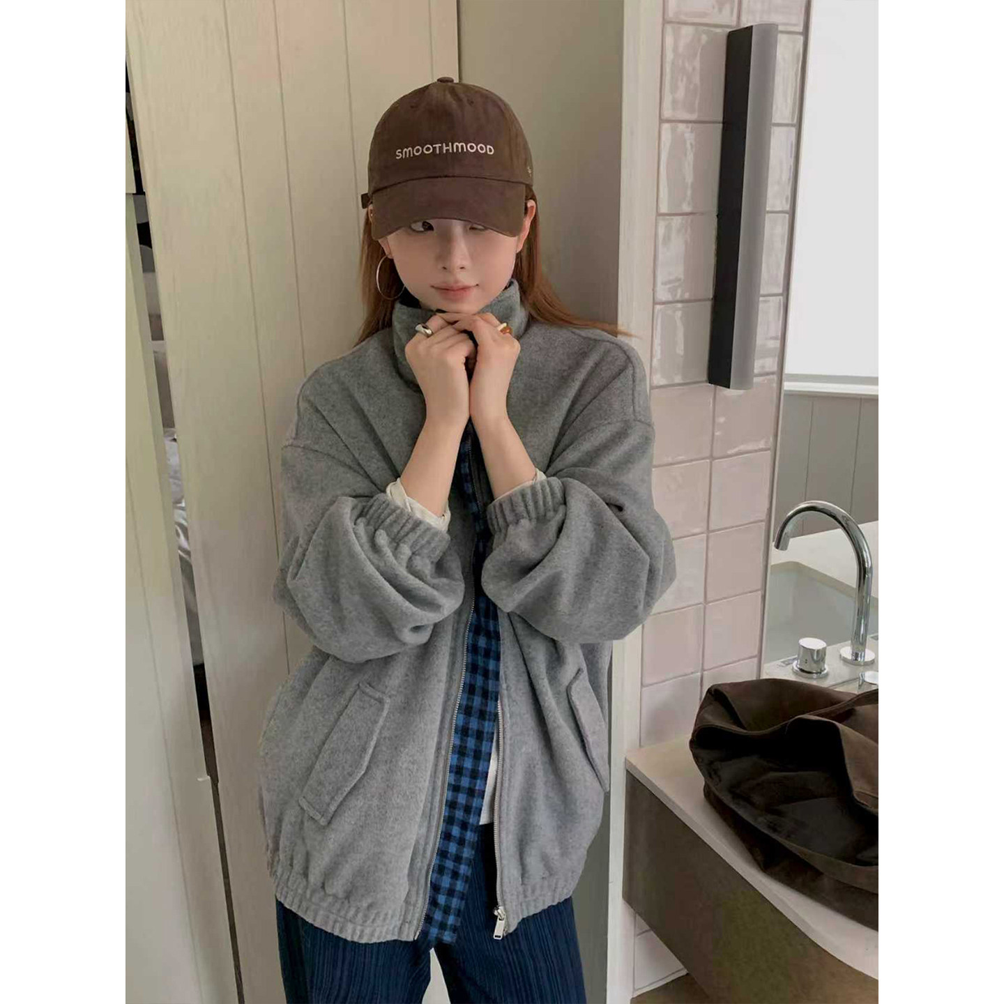 【现货】CCKOK 拼格纹毛呢棒球服休闲外套秋季美式复古运动夹克女