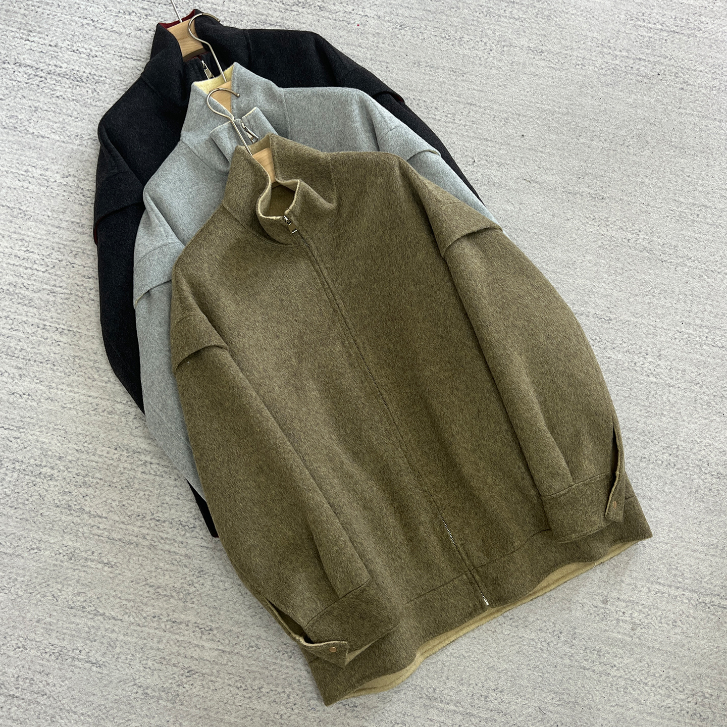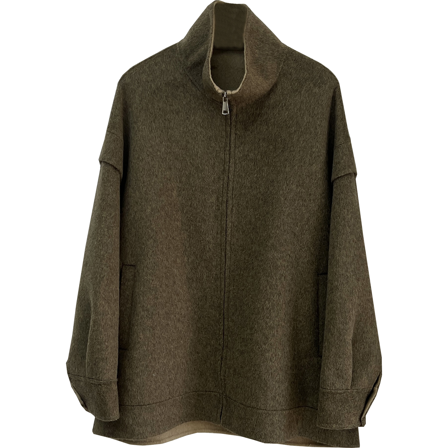 山羊绒+羊毛+天丝简约立领拼色立裁大衣宽松廓形显瘦百搭毛呢外套
