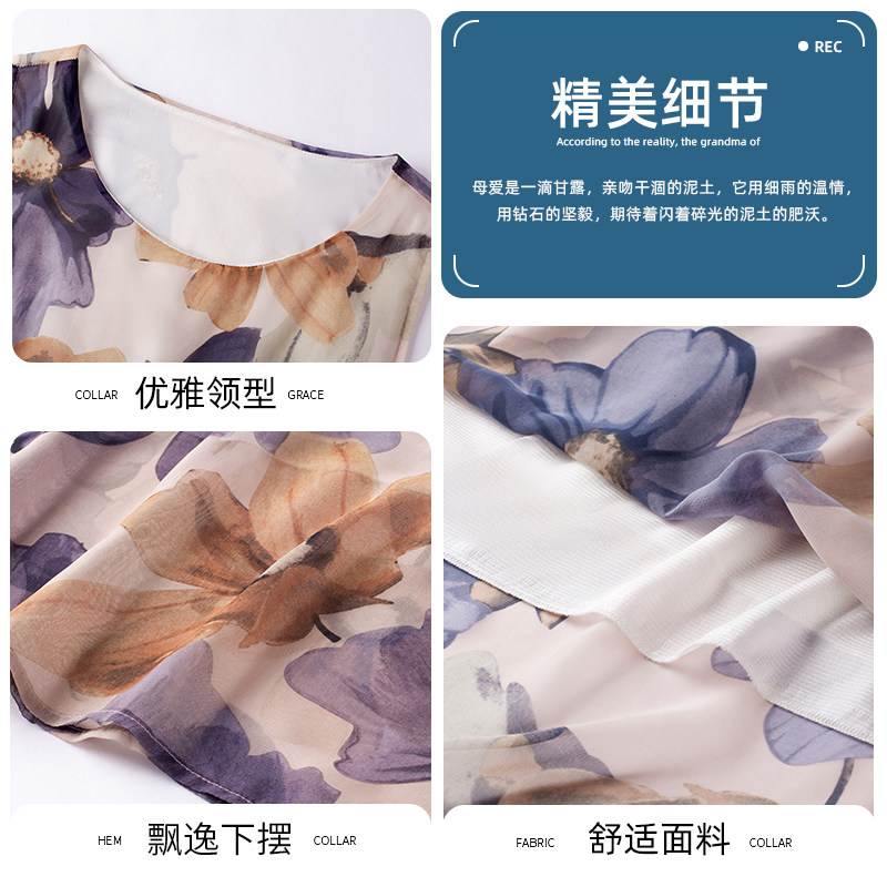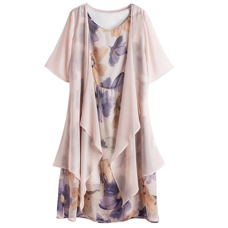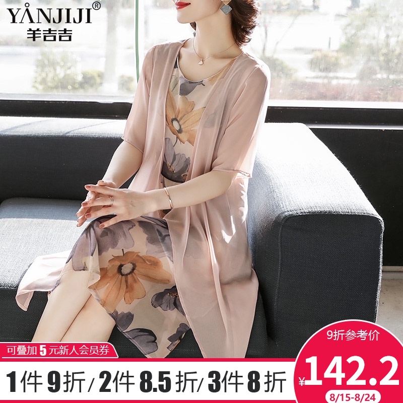 中年女夏装雪纺连衣裙过膝妈妈外搭开衫两件套阔太太印花裙子套装