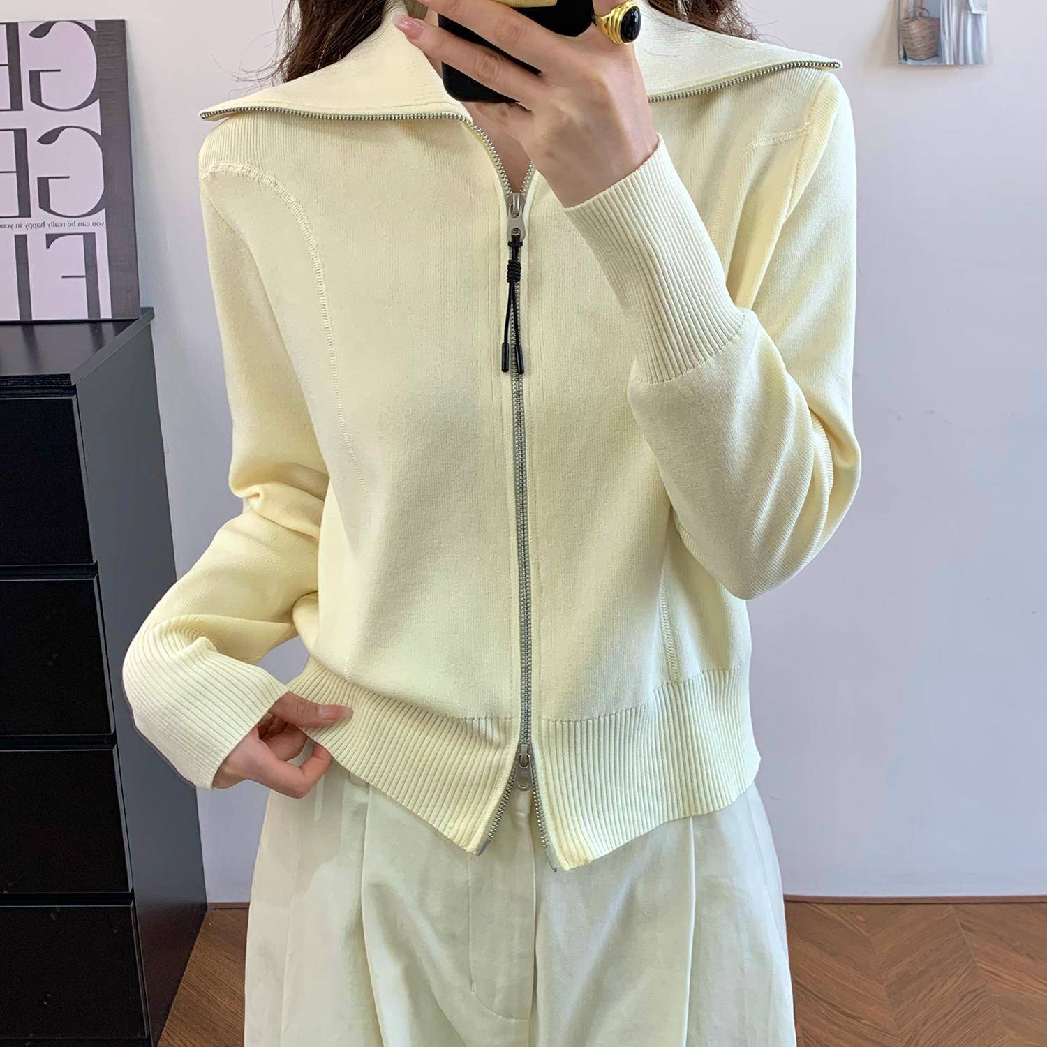 欧洲站2025春装新款上衣女装双拉链宽松显瘦长袖翻领针织衫开衫女