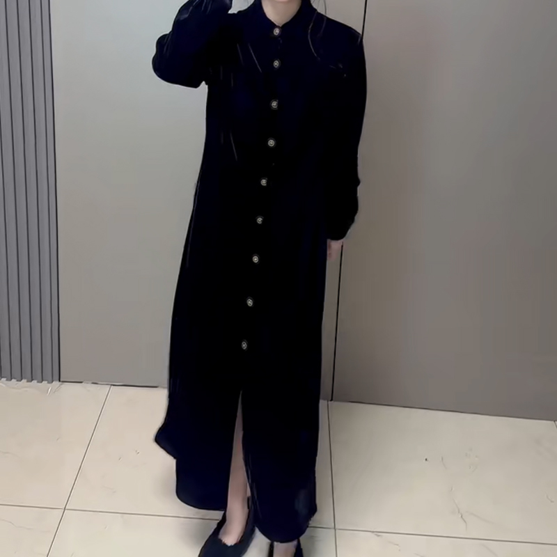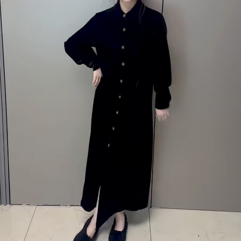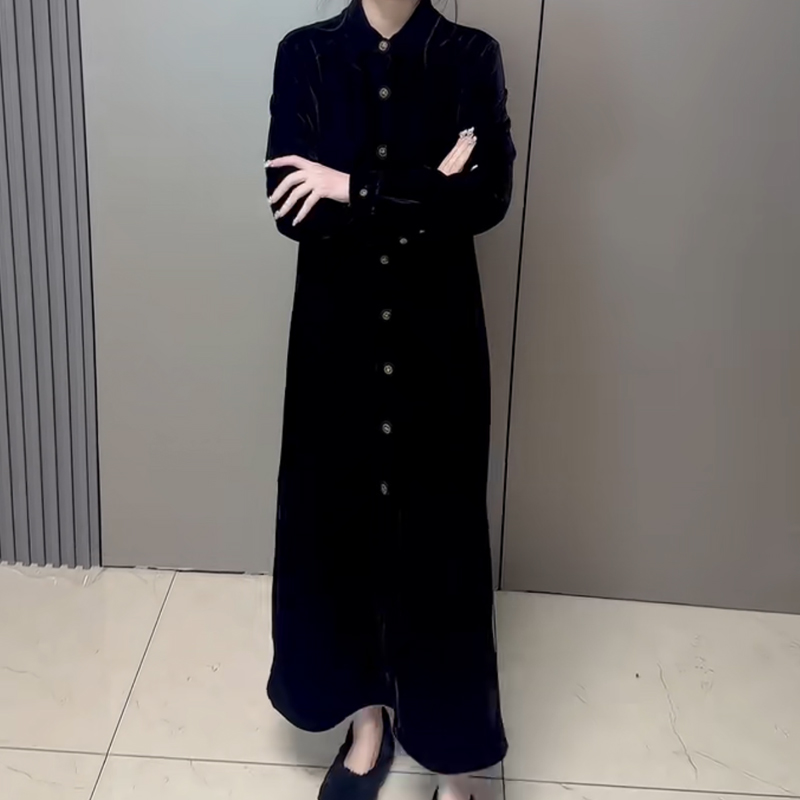 纯色成熟气质2025秋冬欧货休闲丝绒长袖宽松纽扣高级感长款连衣裙