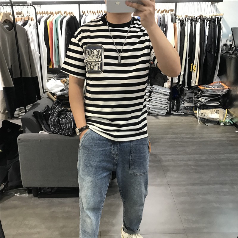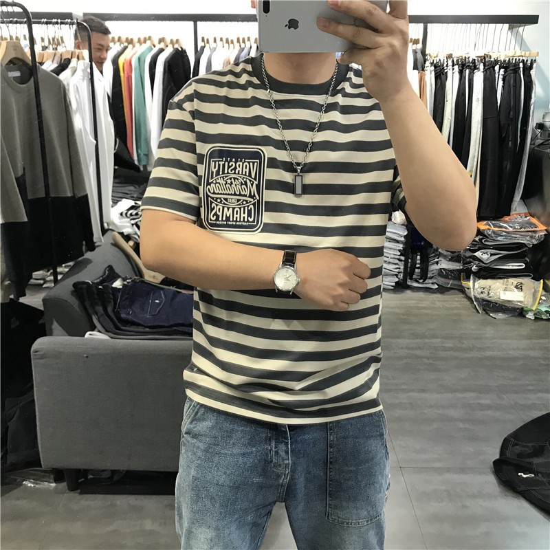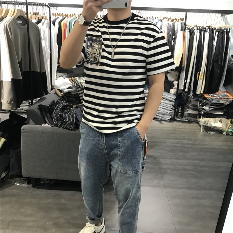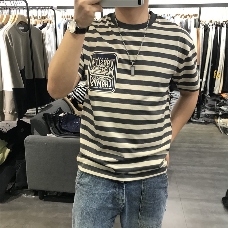 2025夏季新款男士条纹短袖T恤青年个性弹力休闲上衣潮流百搭半袖