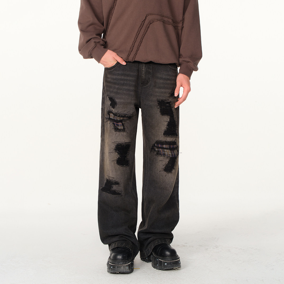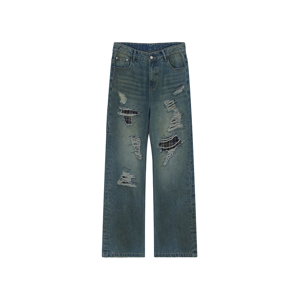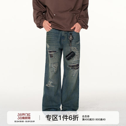 FORNINES乱针绣贴布水洗破坏牛仔裤男潮牌春秋直筒裤美式复古长裤