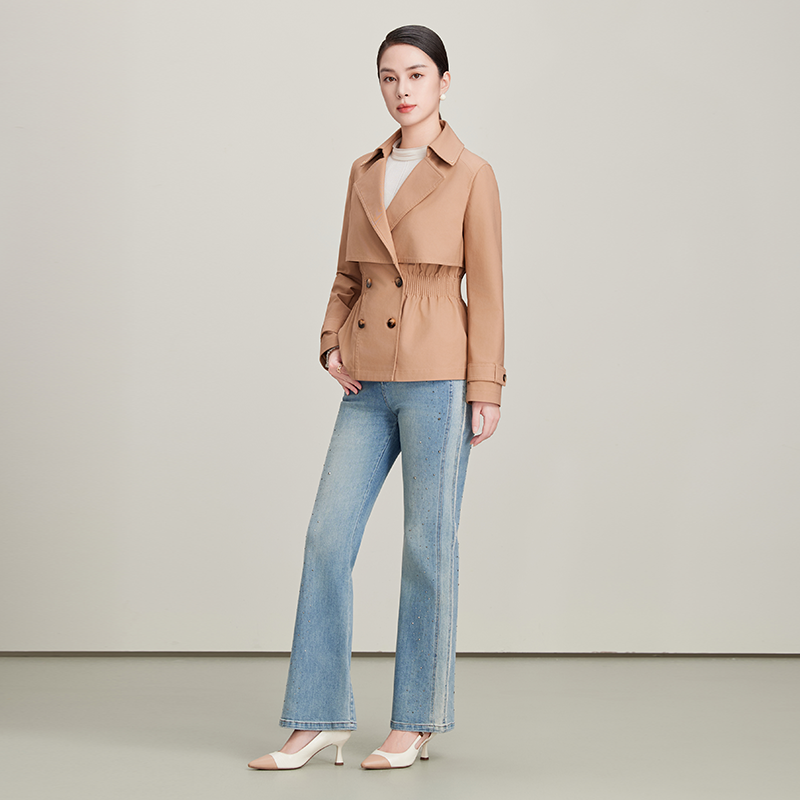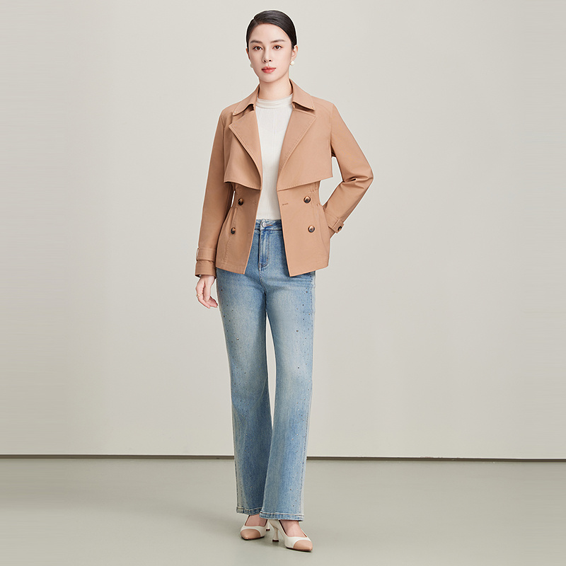 赢智尚卡其色短款高支风衣女2025秋季新款小个子高级感牛仔裤套装