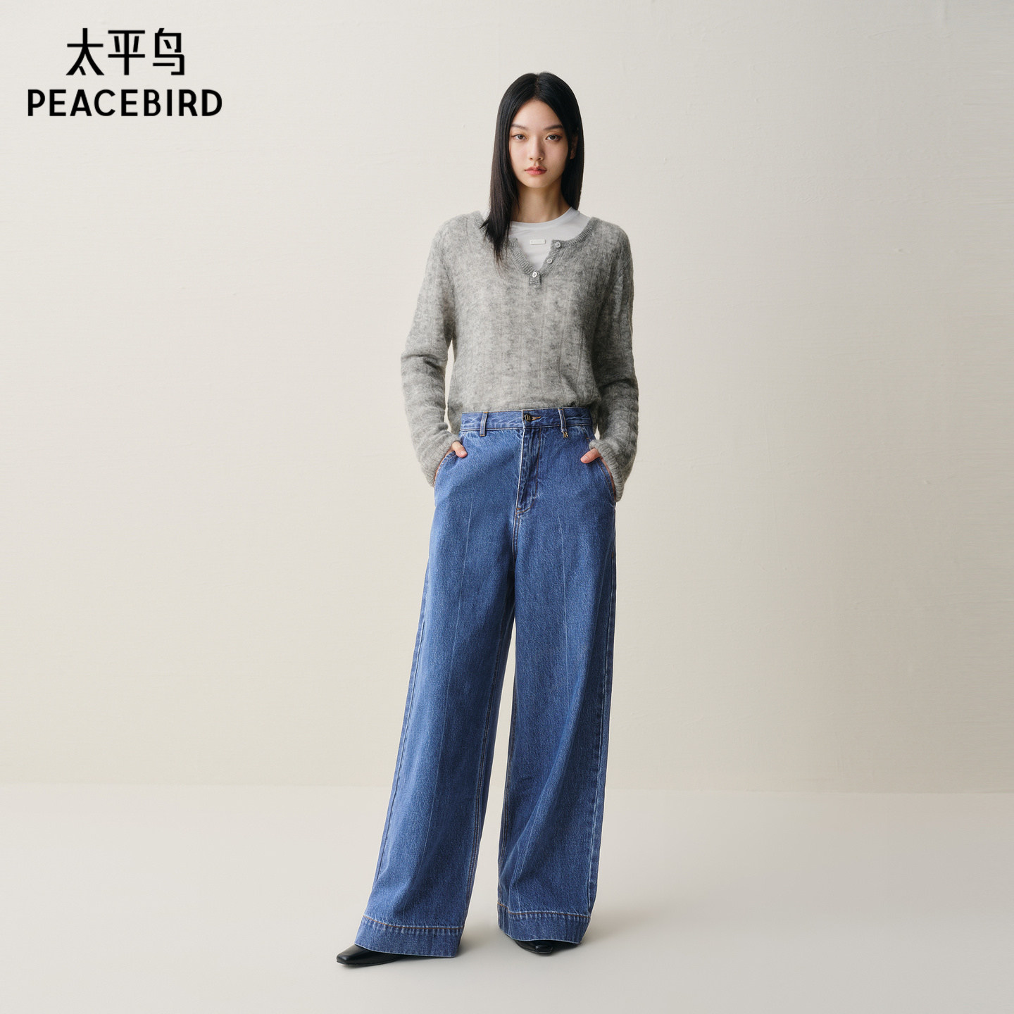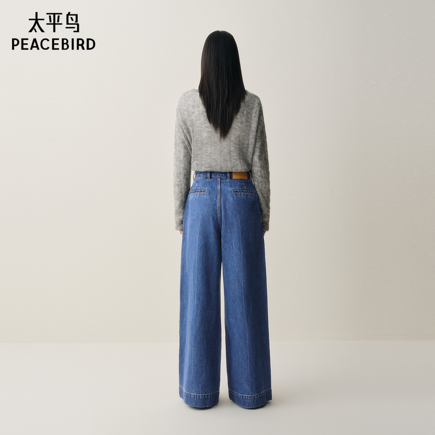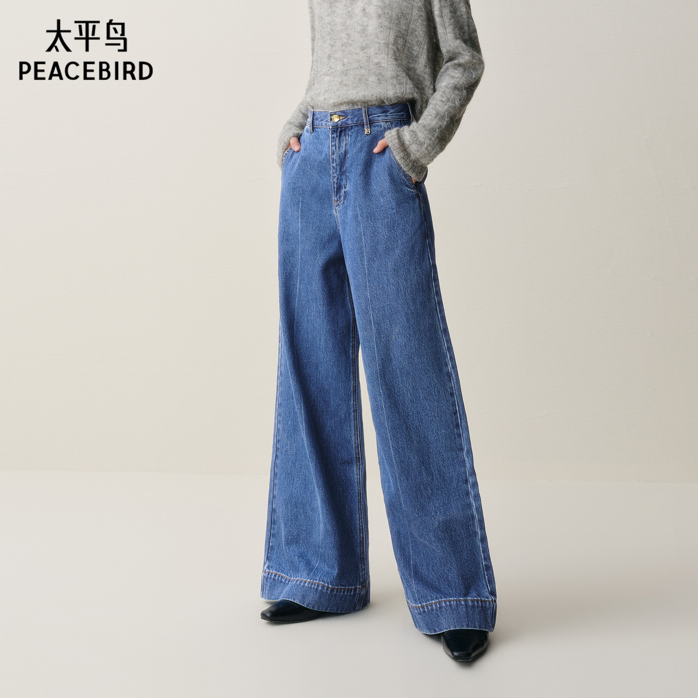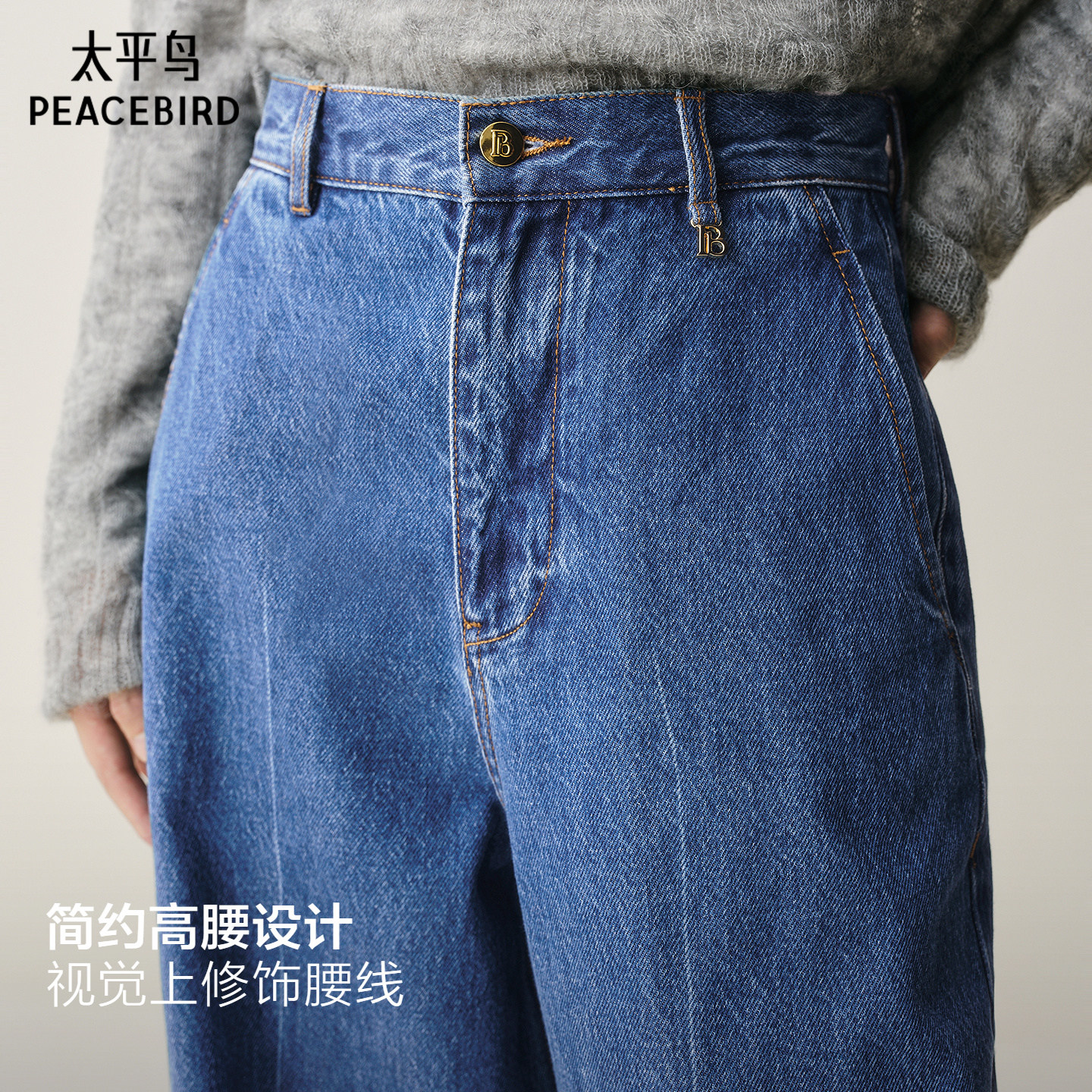太平鸟阔腿牛仔裤款优雅高腰宽松大直筒阔腿牛仔裤女A1HAE416V