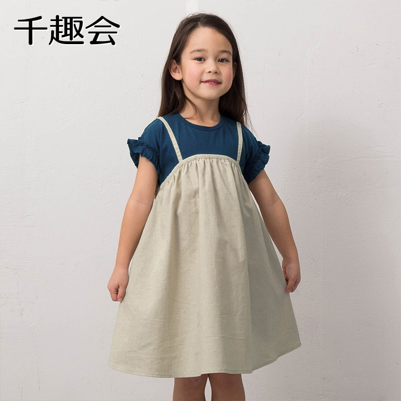 千趣会童装儿童夏季短袖连衣裙女童花边袖裙子假两件撞色拼接透气
