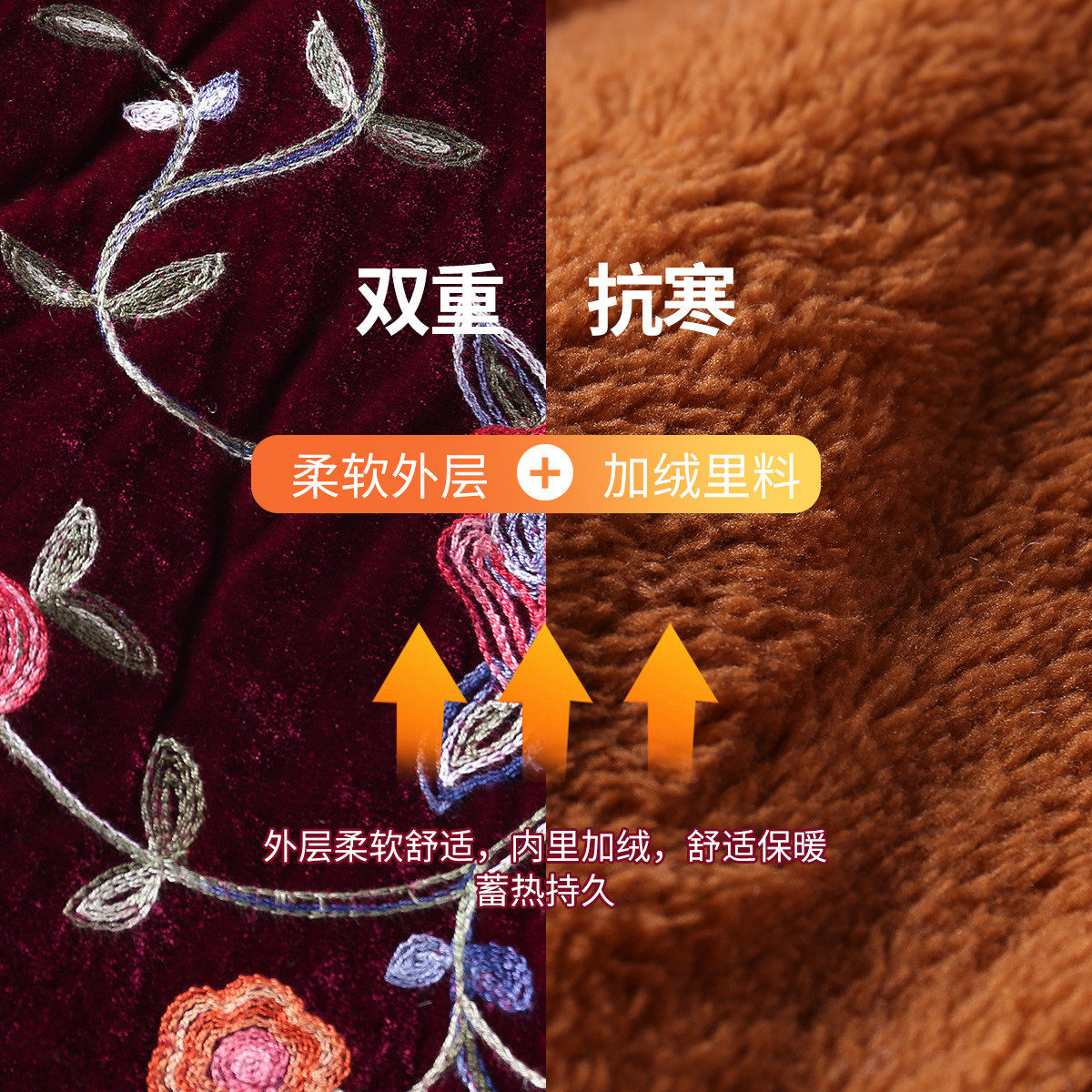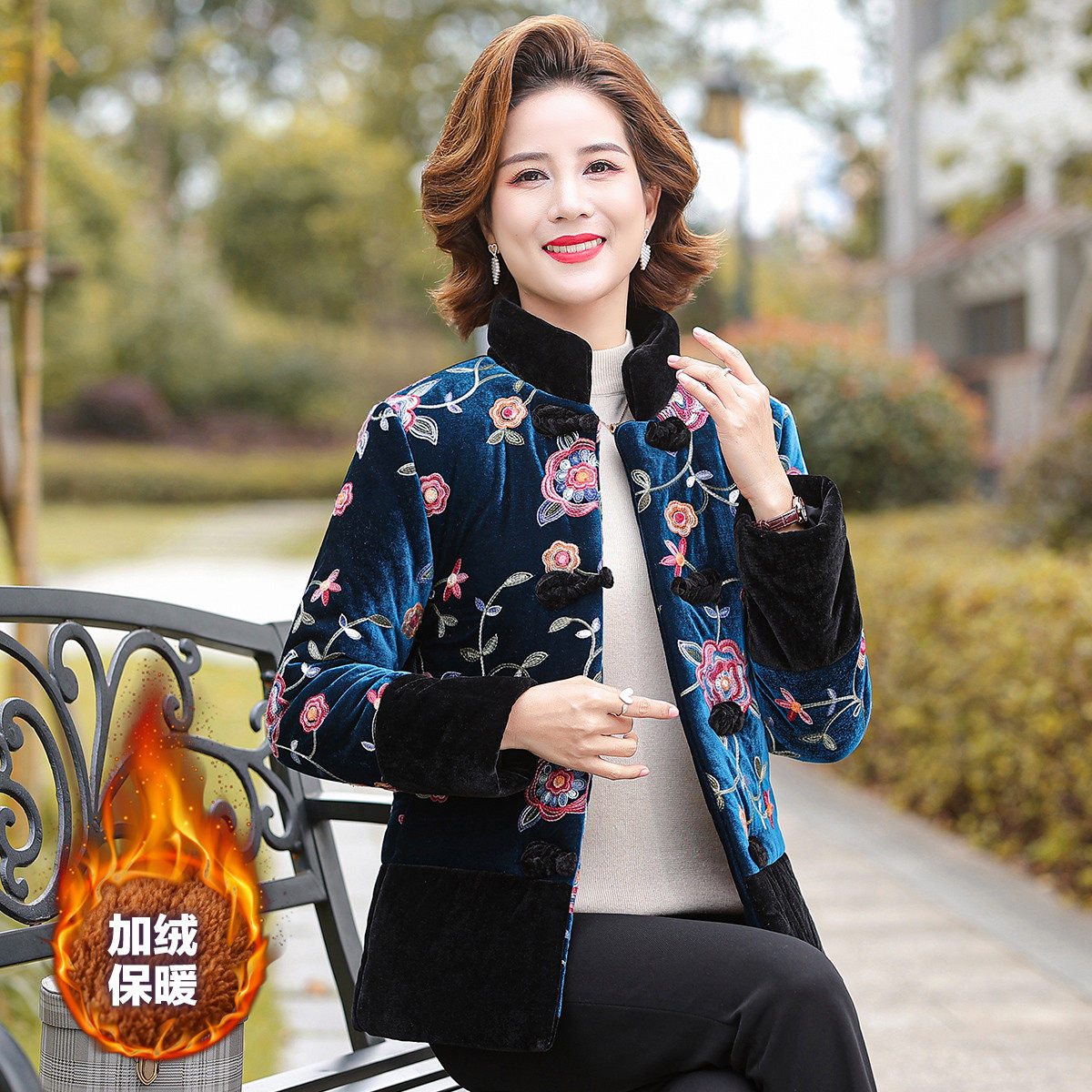 台格棉衣加绒加厚冬中老年妈妈装复古风立领盘扣绣花丝绒唐装外套