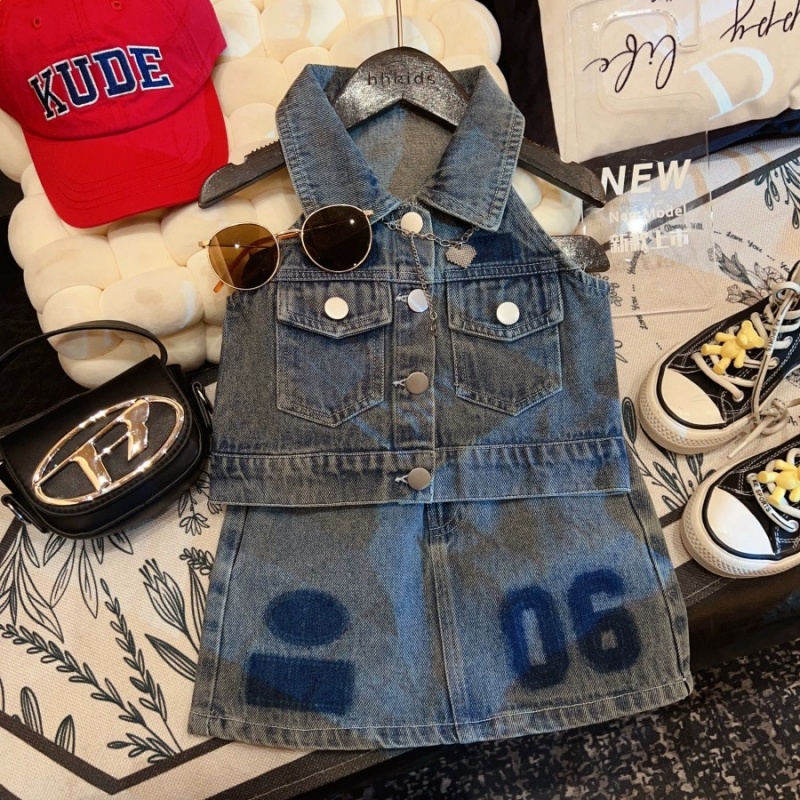 夏季新款女童洋气牛仔背心两件套韩版儿童宝宝无袖牛仔短裙套装潮