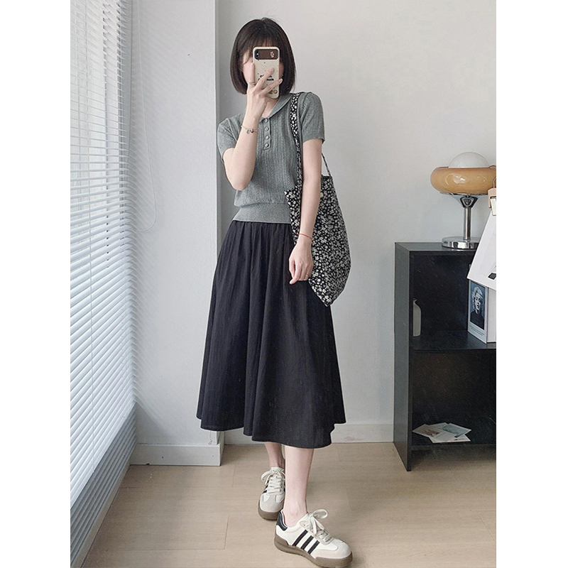 法式Polo娃娃领针织短袖女夏季卡腰短款正肩冰丝T恤翻领灰色上衣