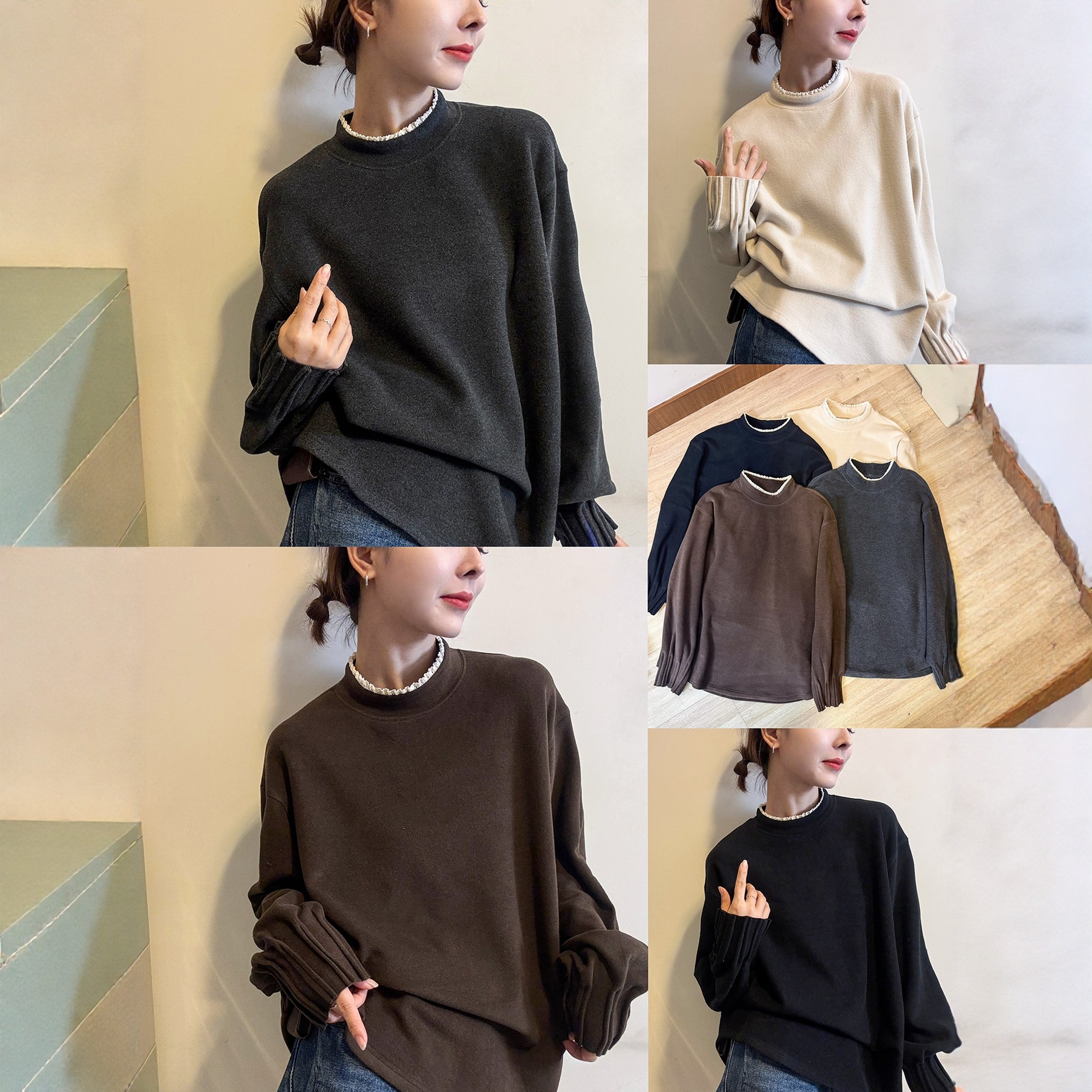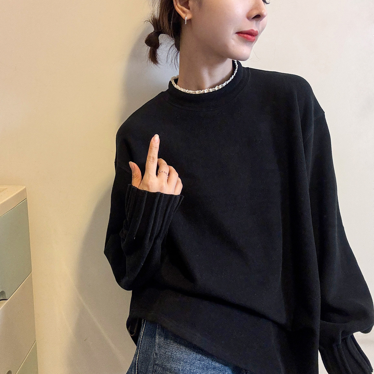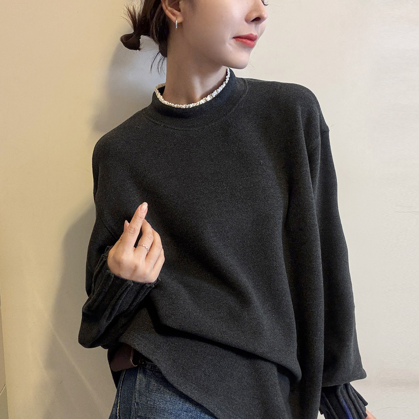 蕾丝高领磨毛加绒T恤女欧洲站潮