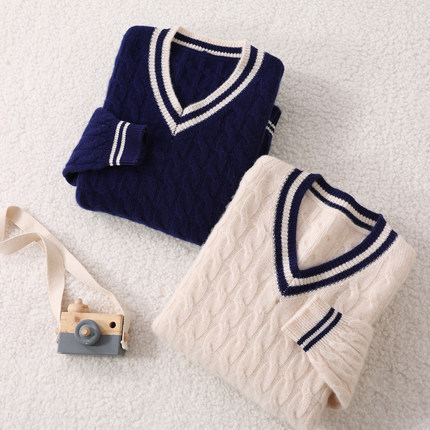 冬季100%羊毛衫儿童V领加厚毛衣男全羊毛针织打底衫保暖中大童装