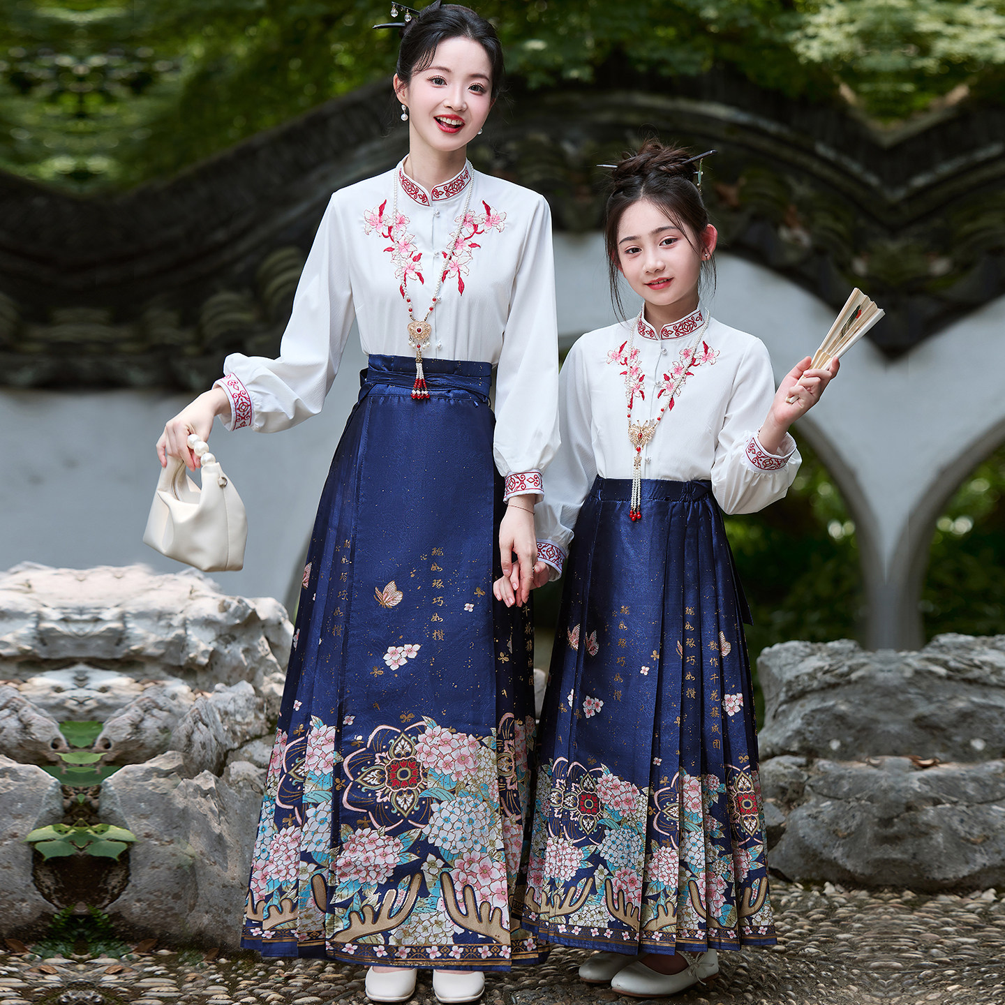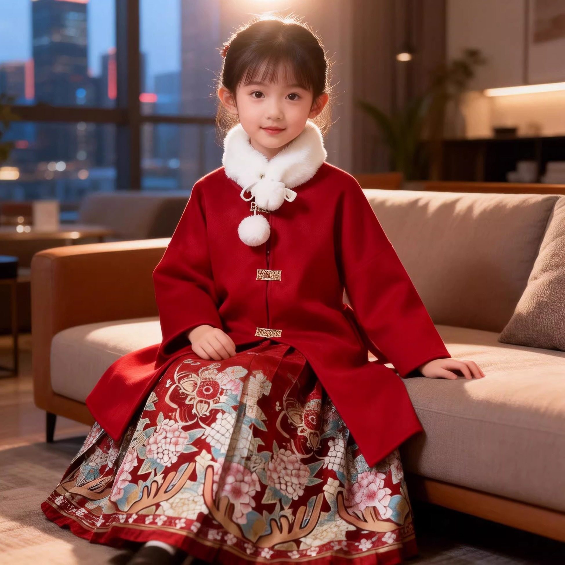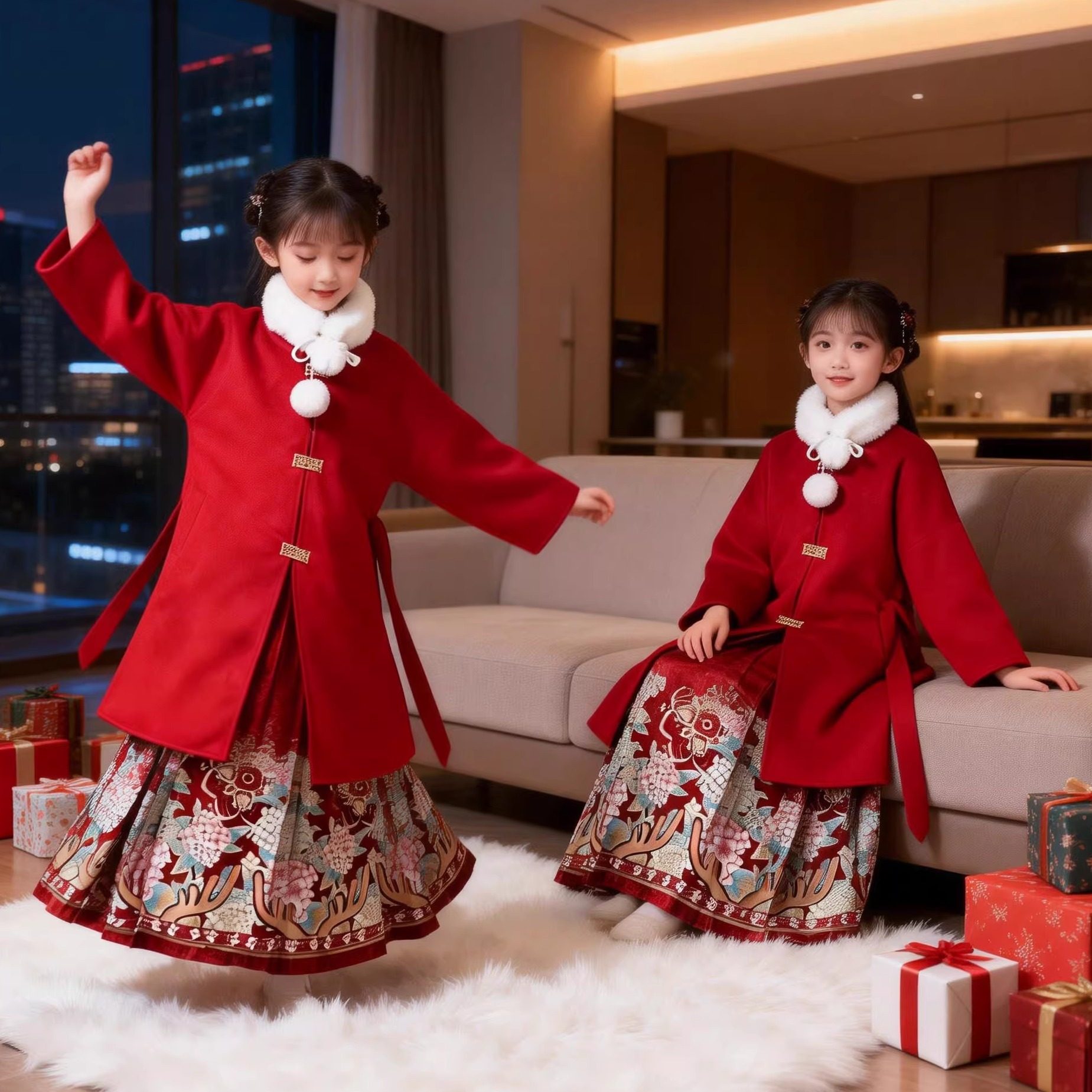 女童高端织金马面裙呢子套装儿童唐装国风新中式拜年服红色亲子装