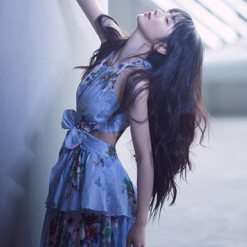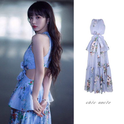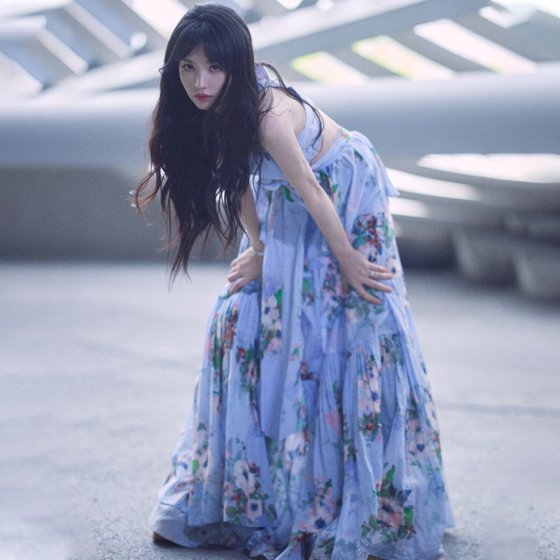 田曦薇同款紫色碎花无袖露背连衣裙女春季法式茶歇海边度假长裙子