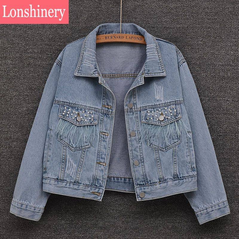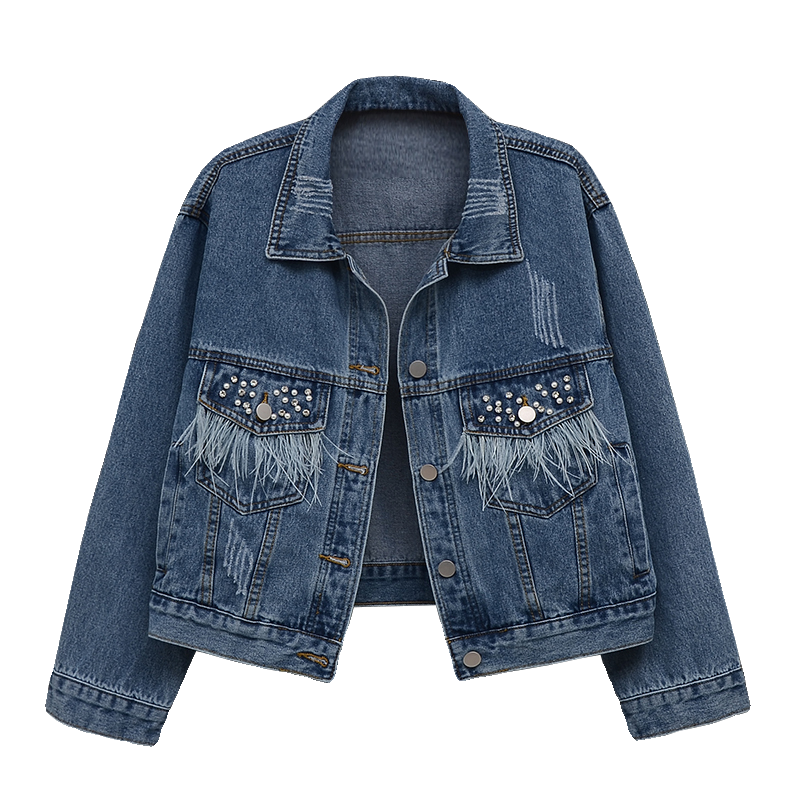 2025春装新款时尚钉珠羽毛装饰美式牛仔女外套短款宽松夹克上衣潮