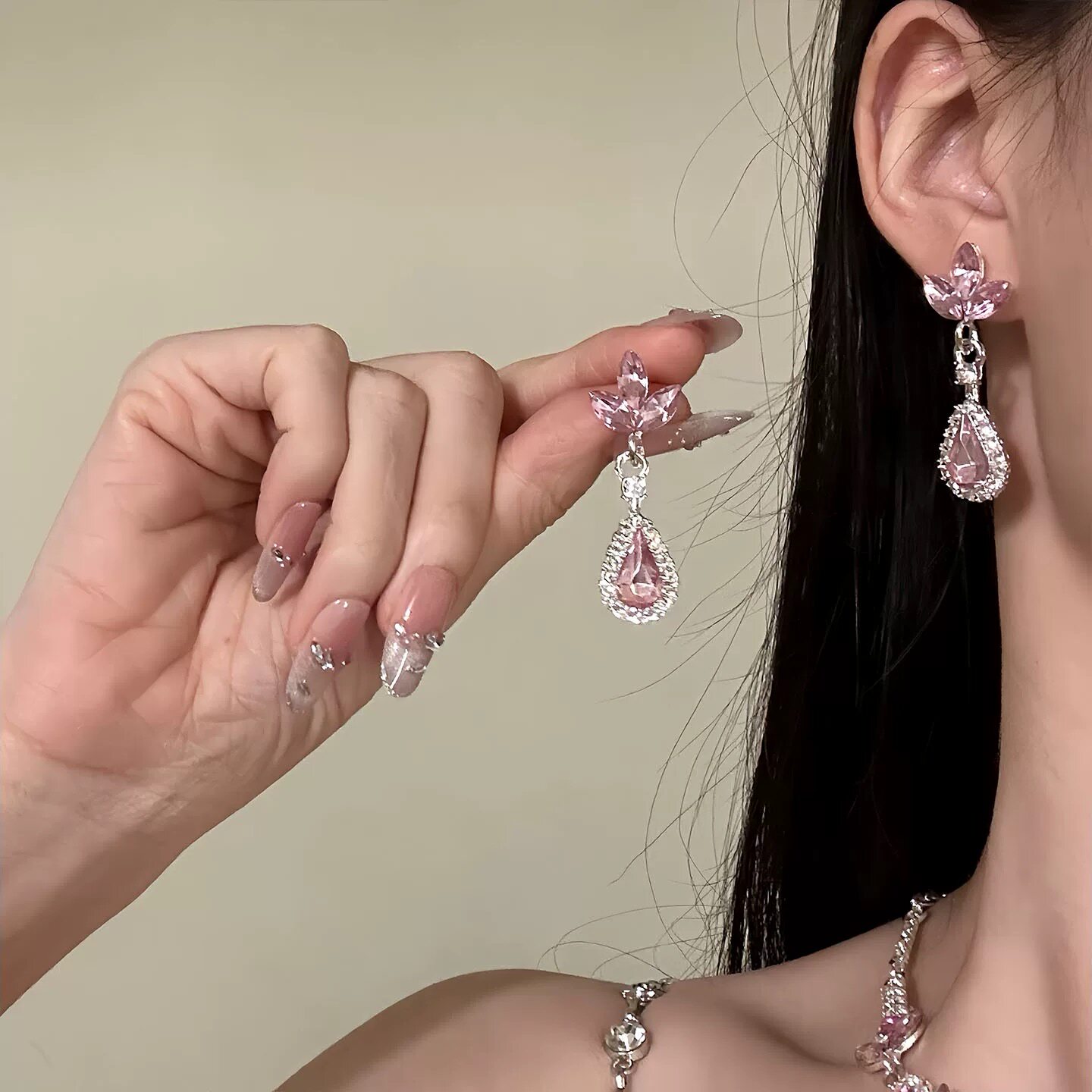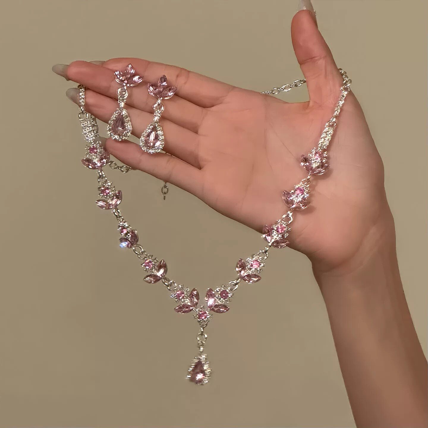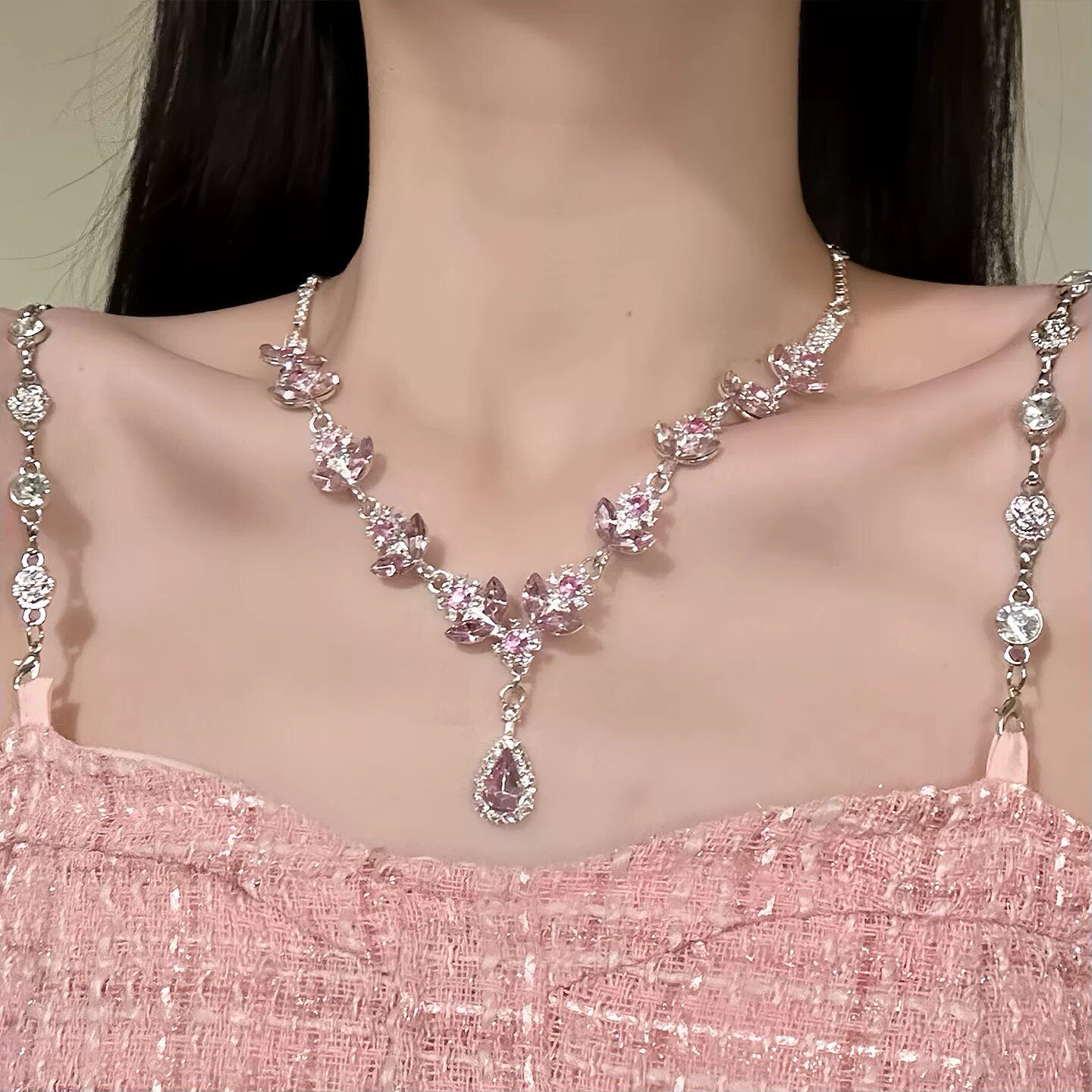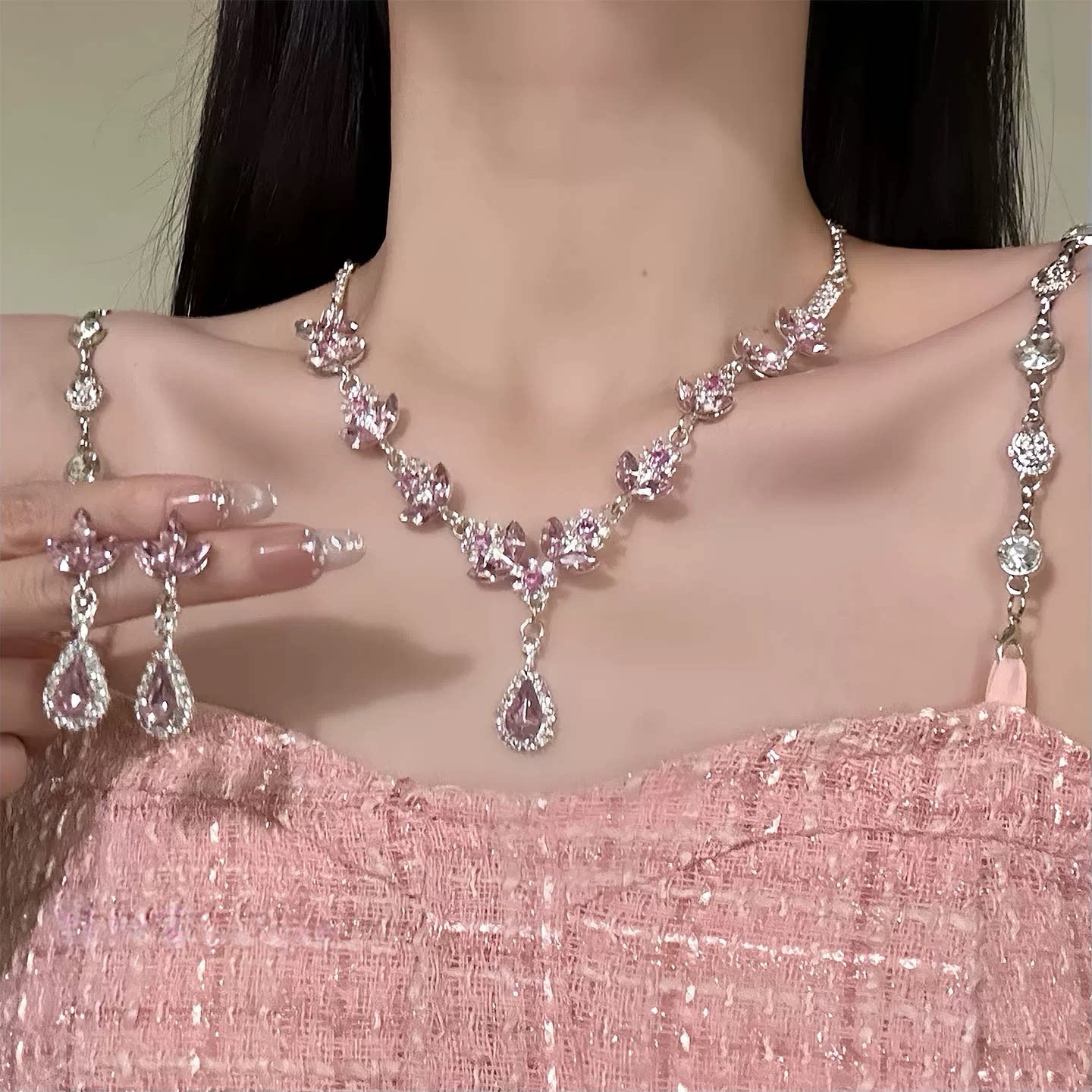 甜美精致粉色樱花闪钻项链耳环宫廷轻奢晚礼服锁骨链水滴耳钉气质