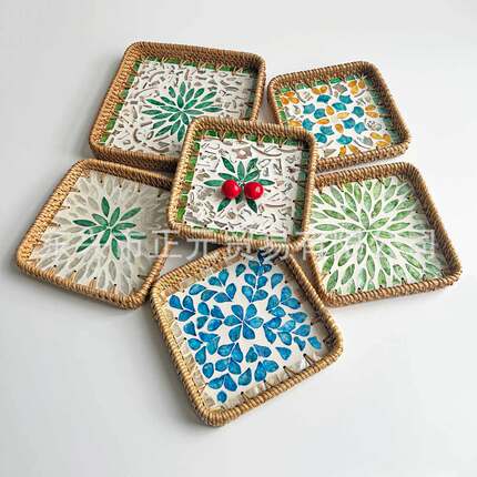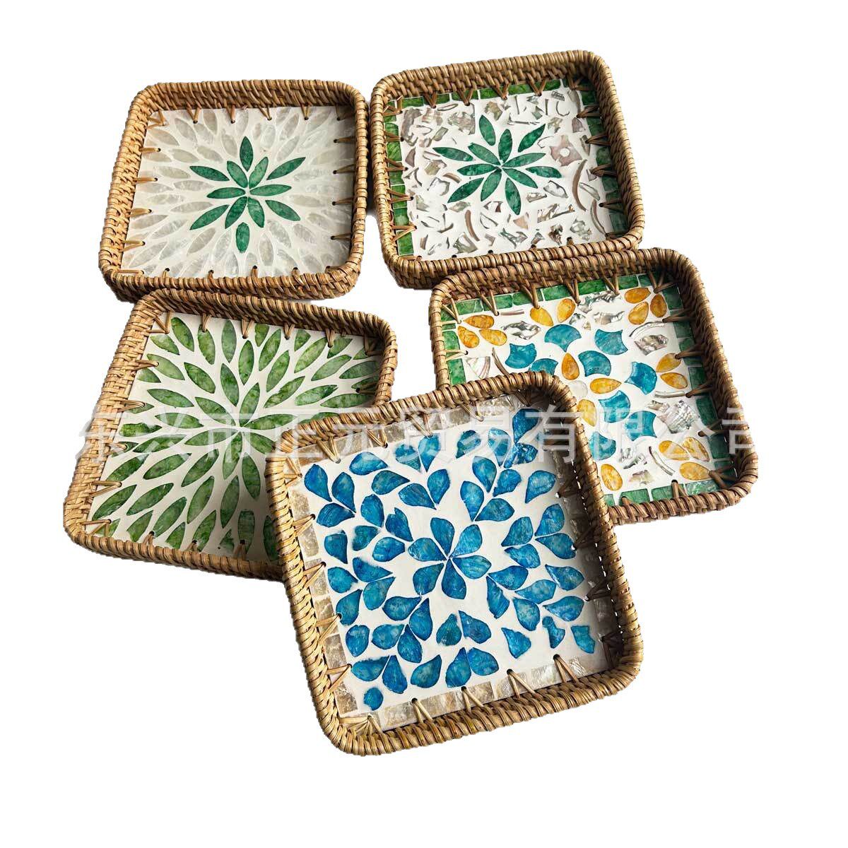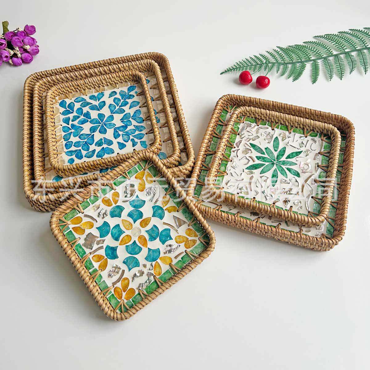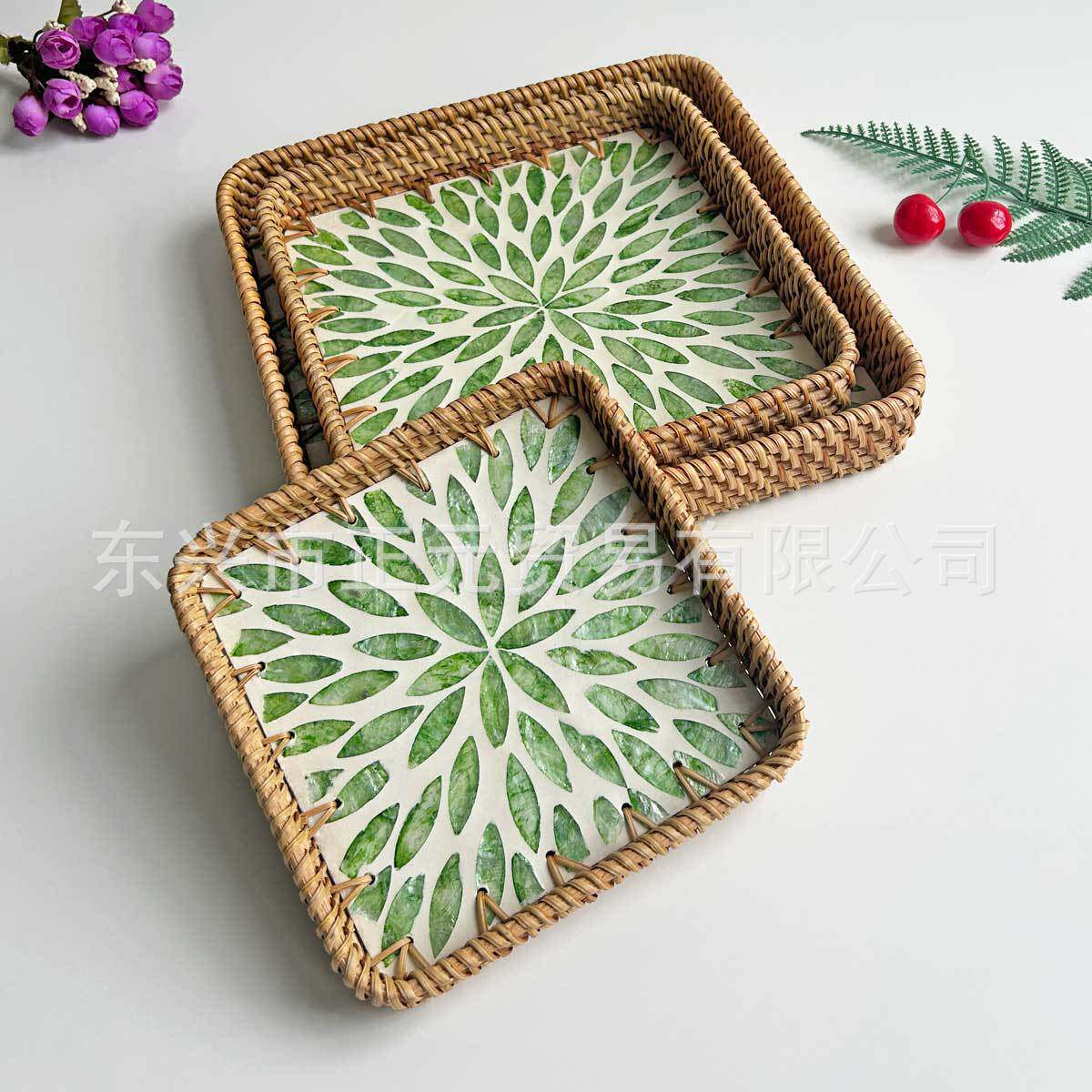 果篮果盘家用方形藤编贝壳托盘手工编织桌面点心篮收纳茶盘贝壳盘