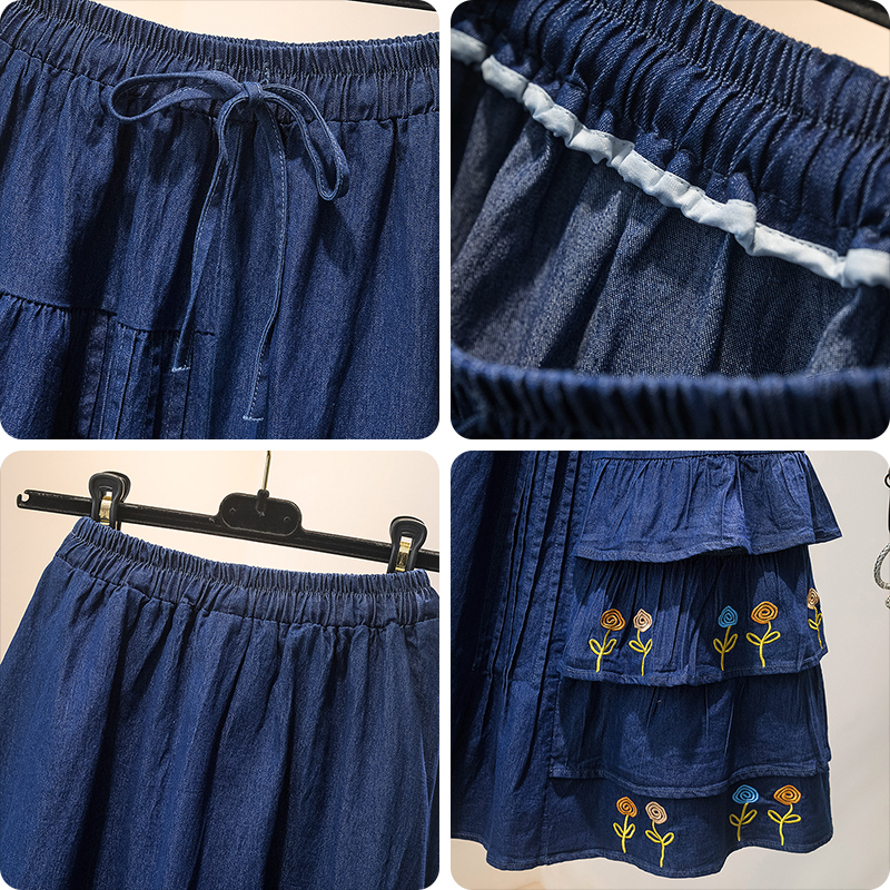 欧货个性刺绣牛仔半身裙女胖mm裙子显瘦百搭高腰宽松a字中长裙子