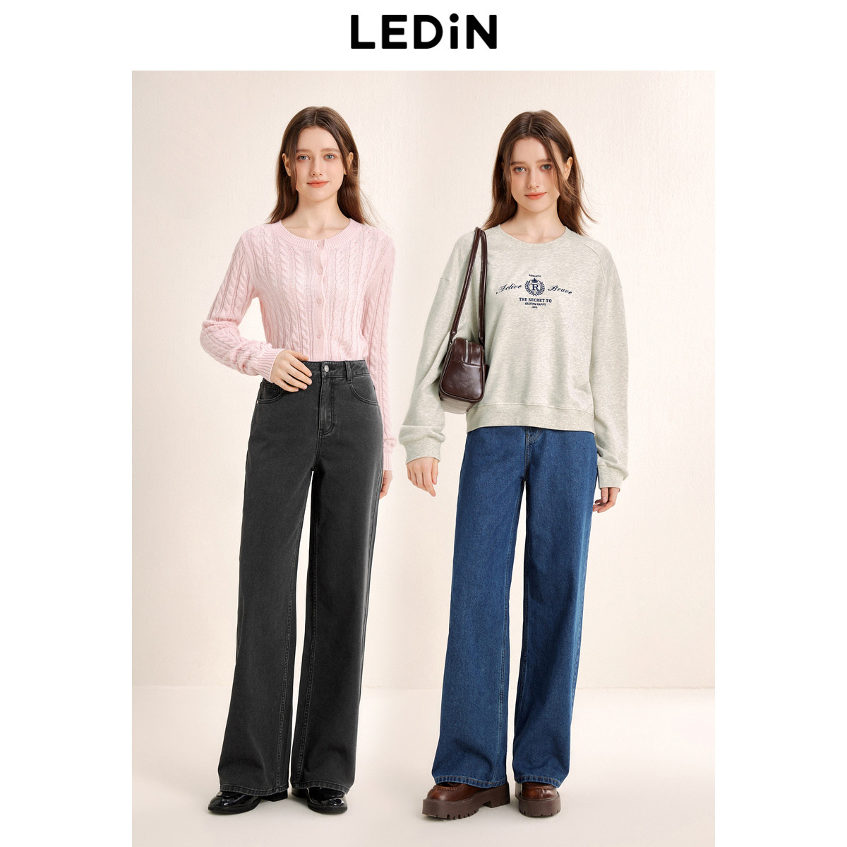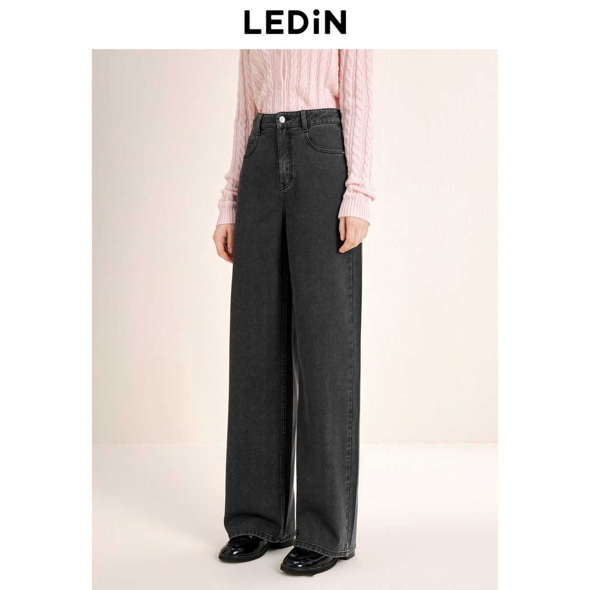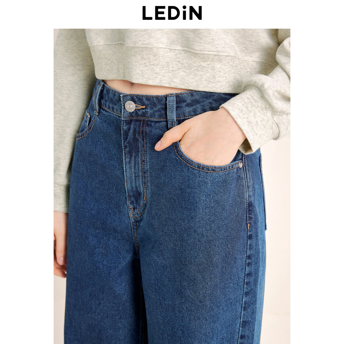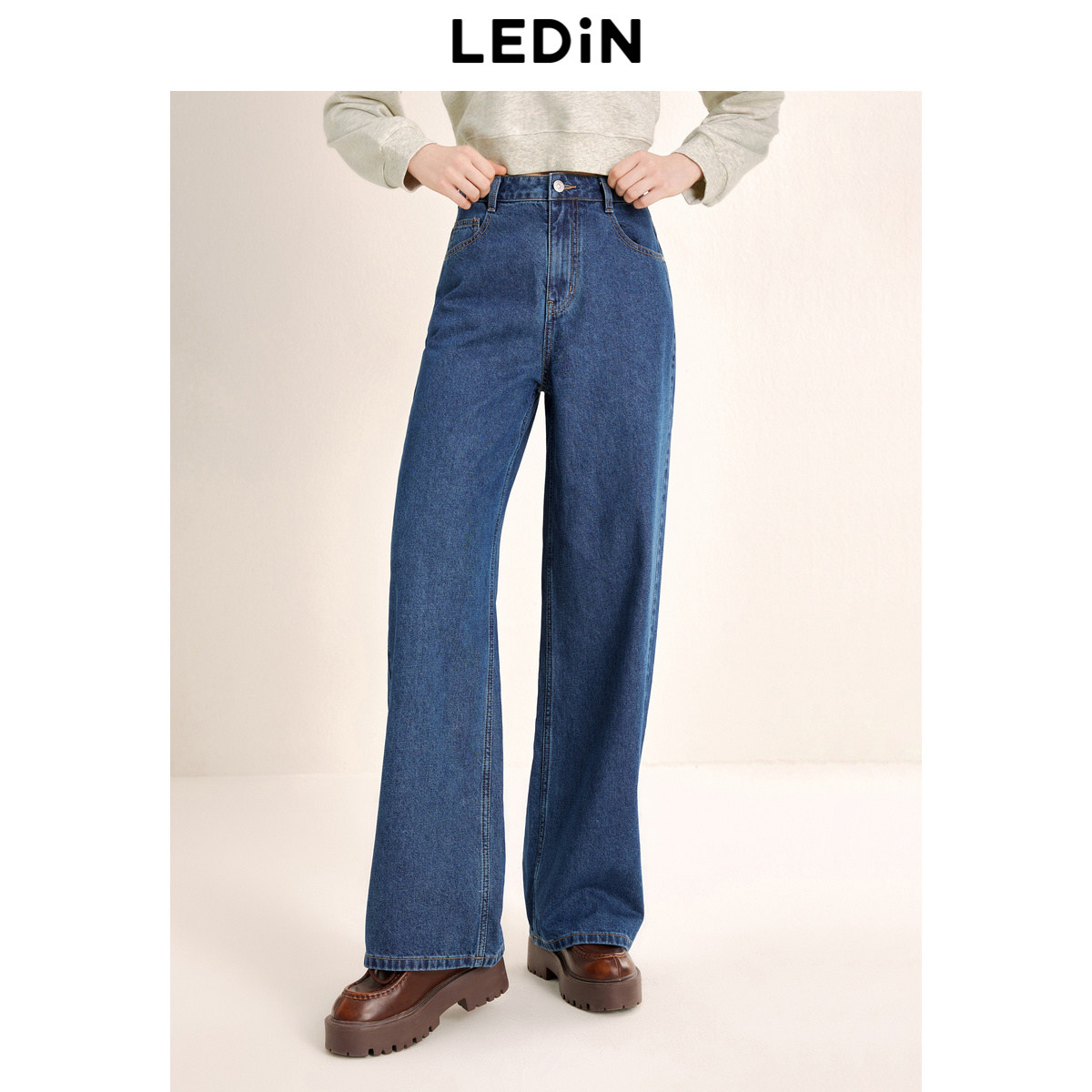 乐町水洗牛仔阔腿裤秋季直筒长裤韩系通勤风全棉女百搭裤子