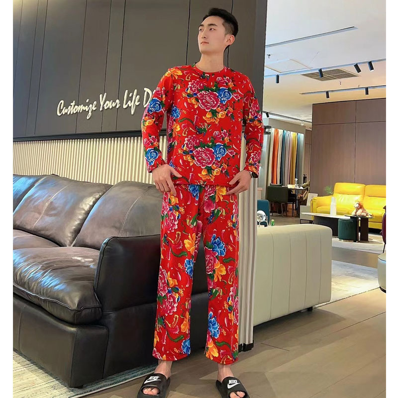 秋冬德绒大红花男士家居服套装宽松长袖长裤东北大花情侣睡衣套装