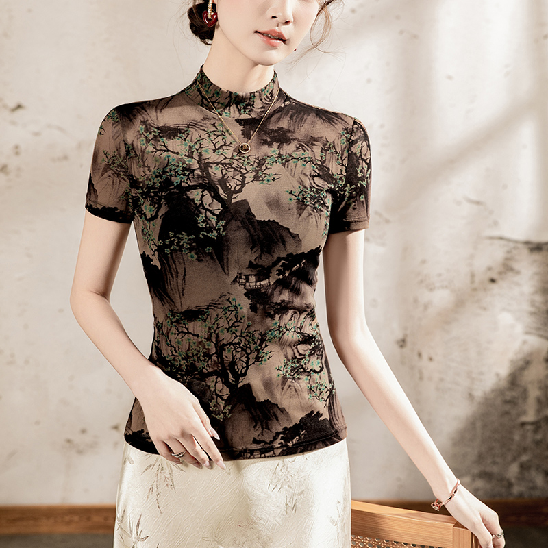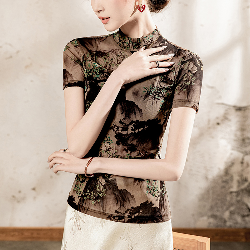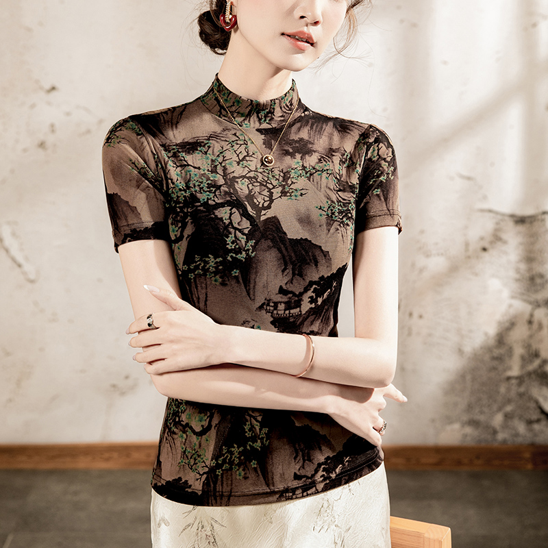 半高领水墨印花网纱T恤女短袖2025秋季新款网眼女装立领上衣小衫