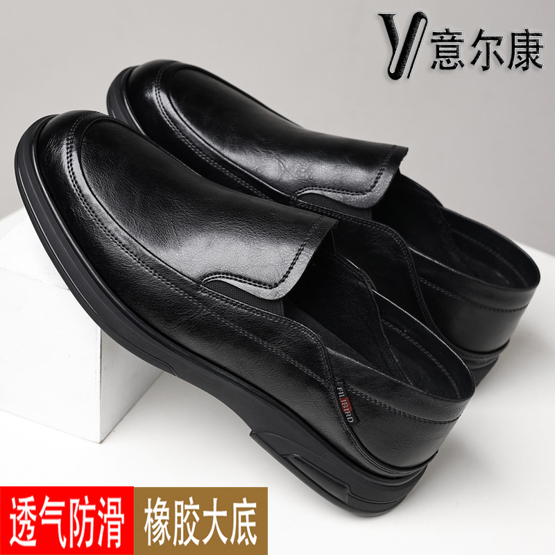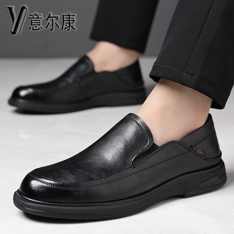 意尔康男鞋新款一脚蹬套脚皮鞋透气真皮休闲鞋轻便耐磨软底驾车鞋