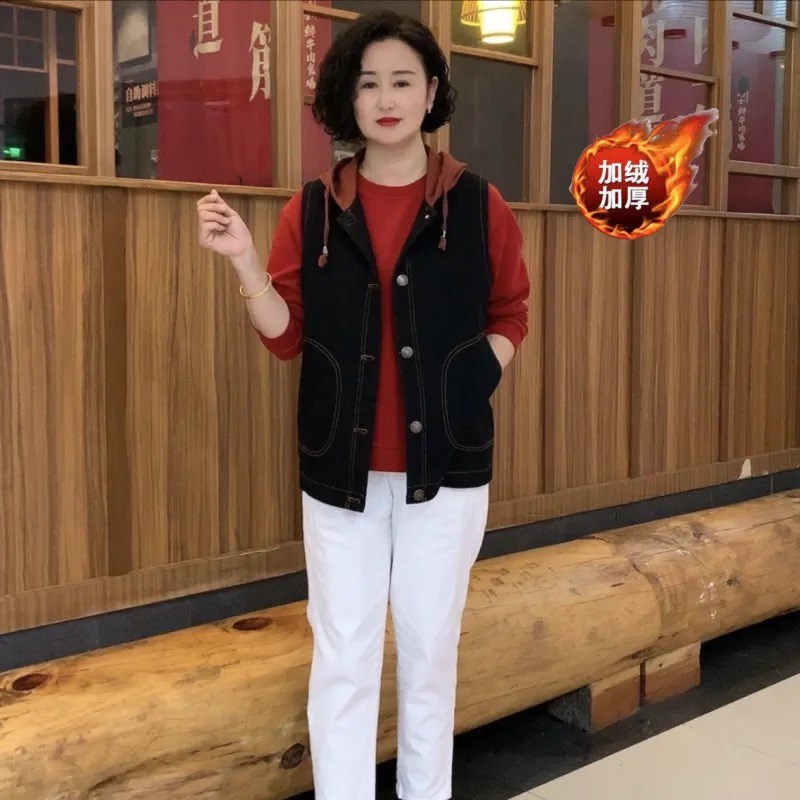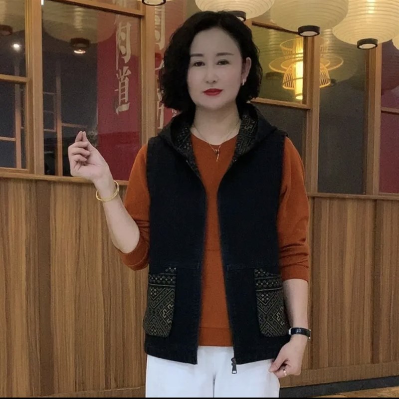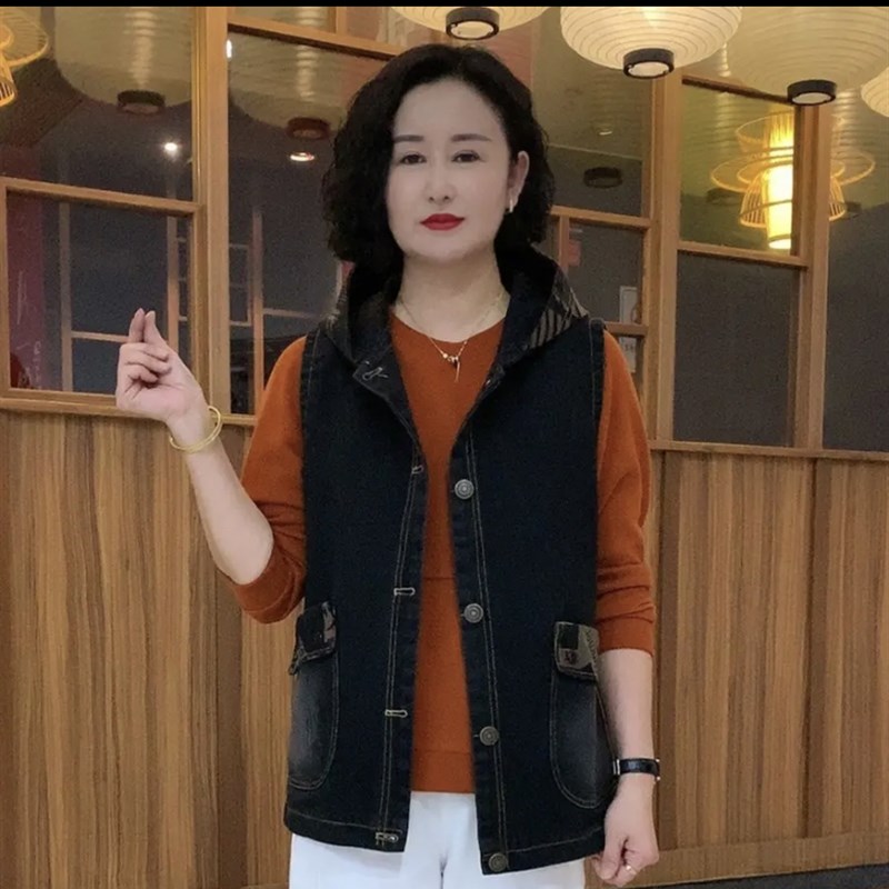 妈妈春秋装新款牛仔马甲外套休闲外穿连帽背心中老年女装大码马夹