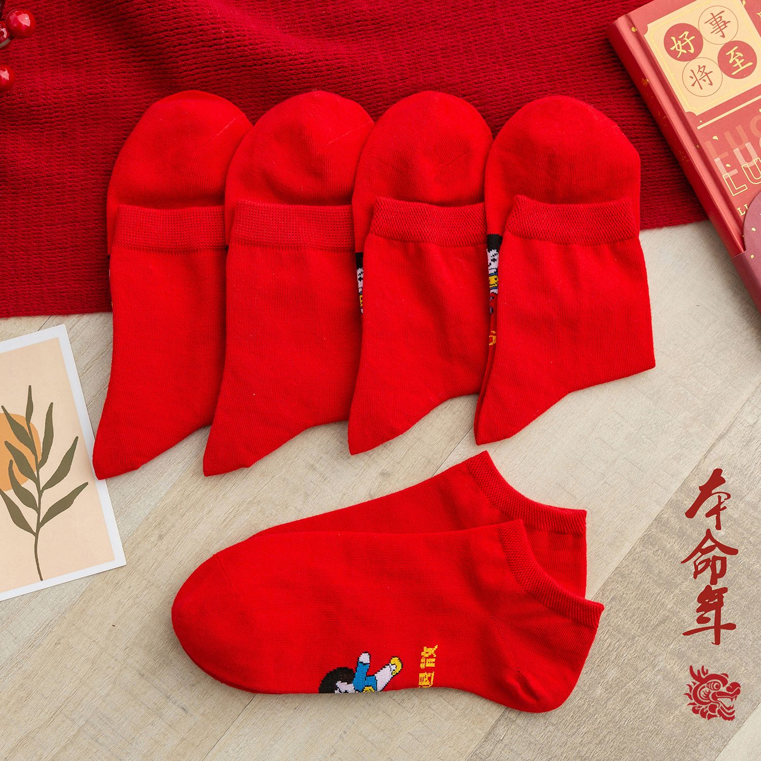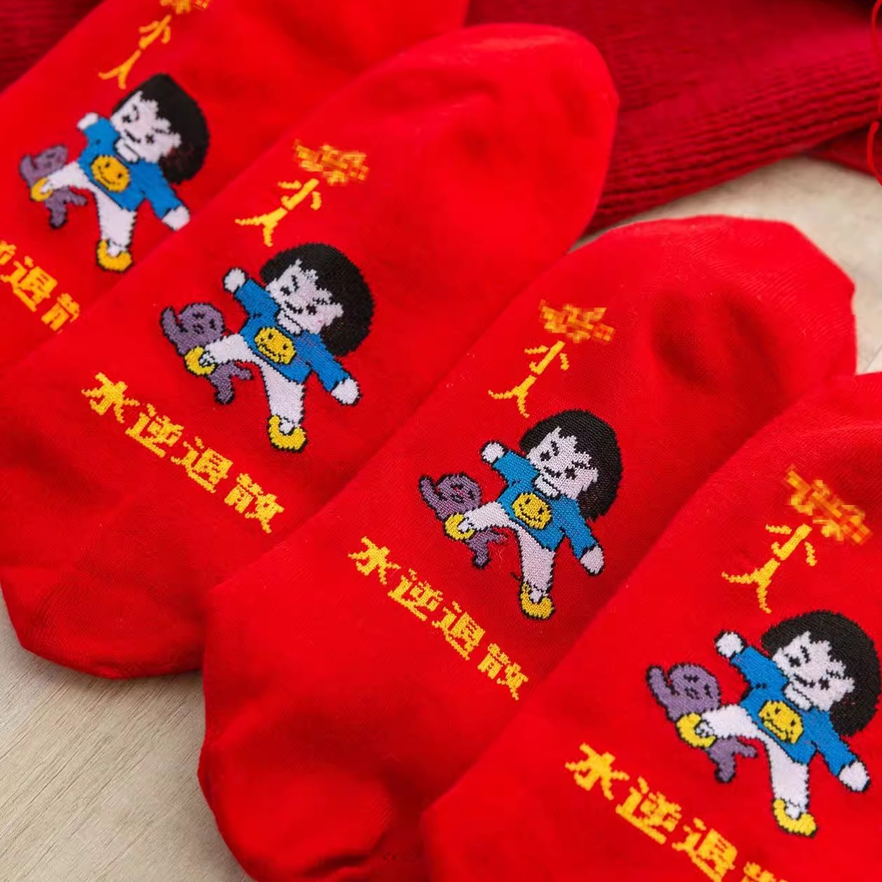 踩地袜本命年红袜子小人男女款龙蛇年中短筒纯红色袜采睬小ren