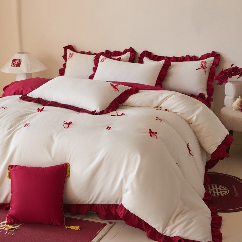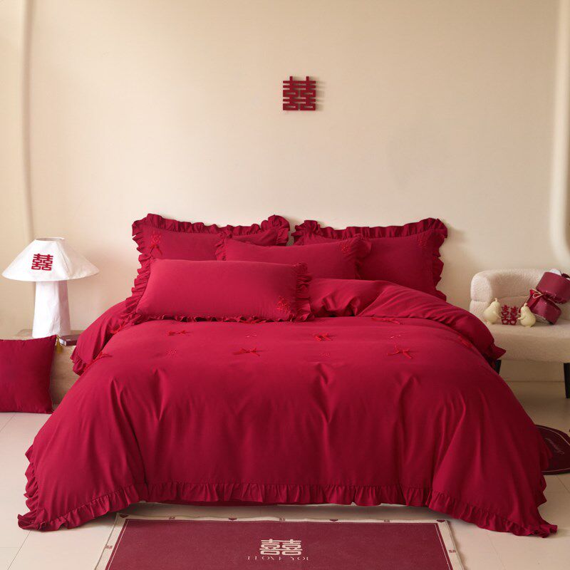 法式浪漫结婚四件套大红色婚庆被套新婚陪嫁床上用品婚房喜被床单