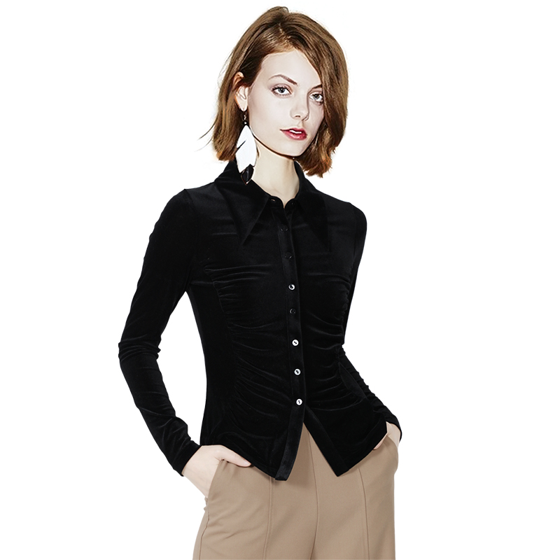 帝柔2025春秋新款设计感褶皱修身显瘦小众丝绒长袖黑色打底衬衫女