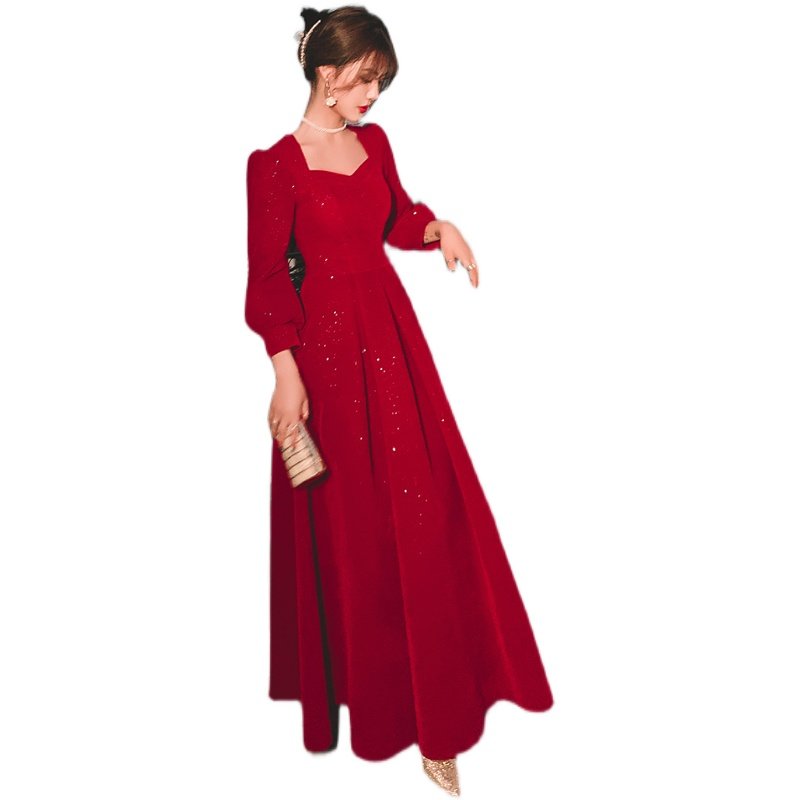 春秋季新娘敬酒服2025新款方领订婚回门日常可穿长袖晚礼服连衣裙