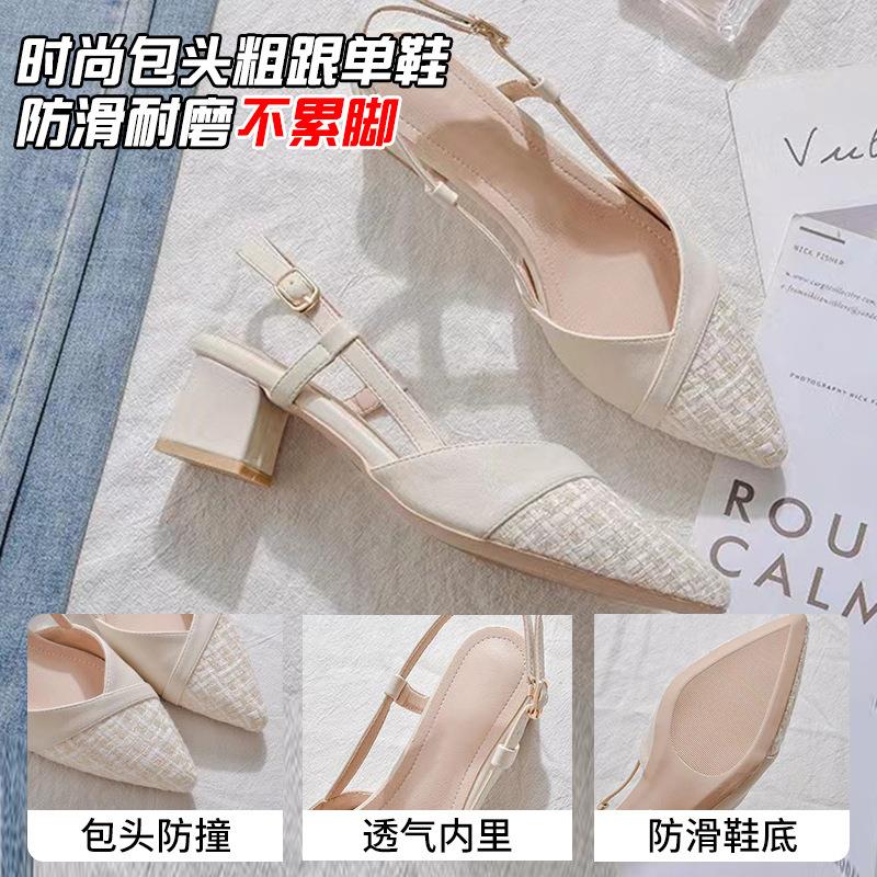 春季新款法式小香风包头粗跟单鞋女鞋尖头一字带中跟凉鞋春夏百搭