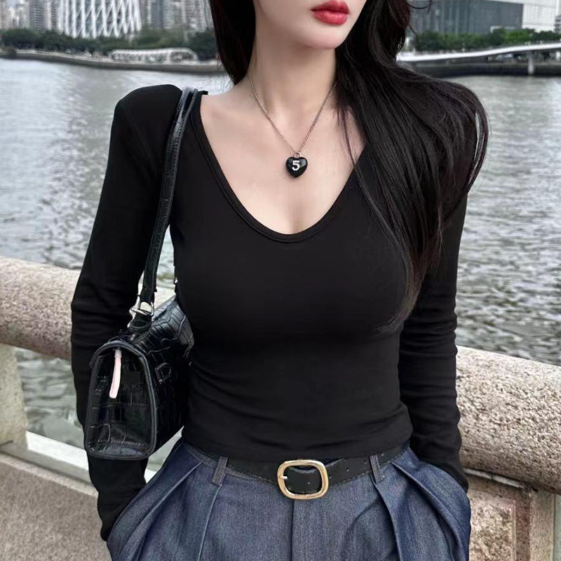 安可拉红长袖t恤女莫代尔内搭春秋新款修身体恤百搭V领打底衫