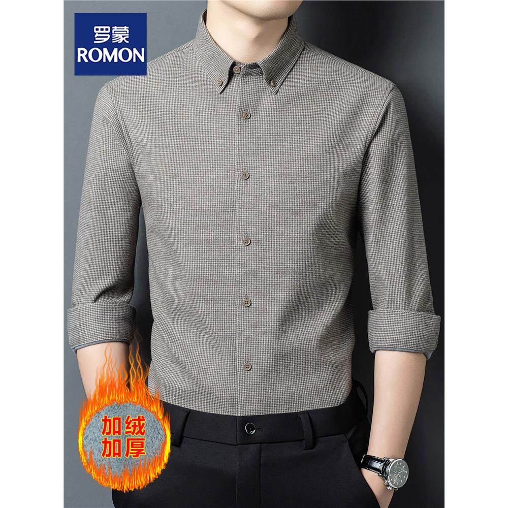 罗蒙高端千鸟格羊毛一体绒衬衫中年男士加绒加厚保暖100%纯棉衬衣