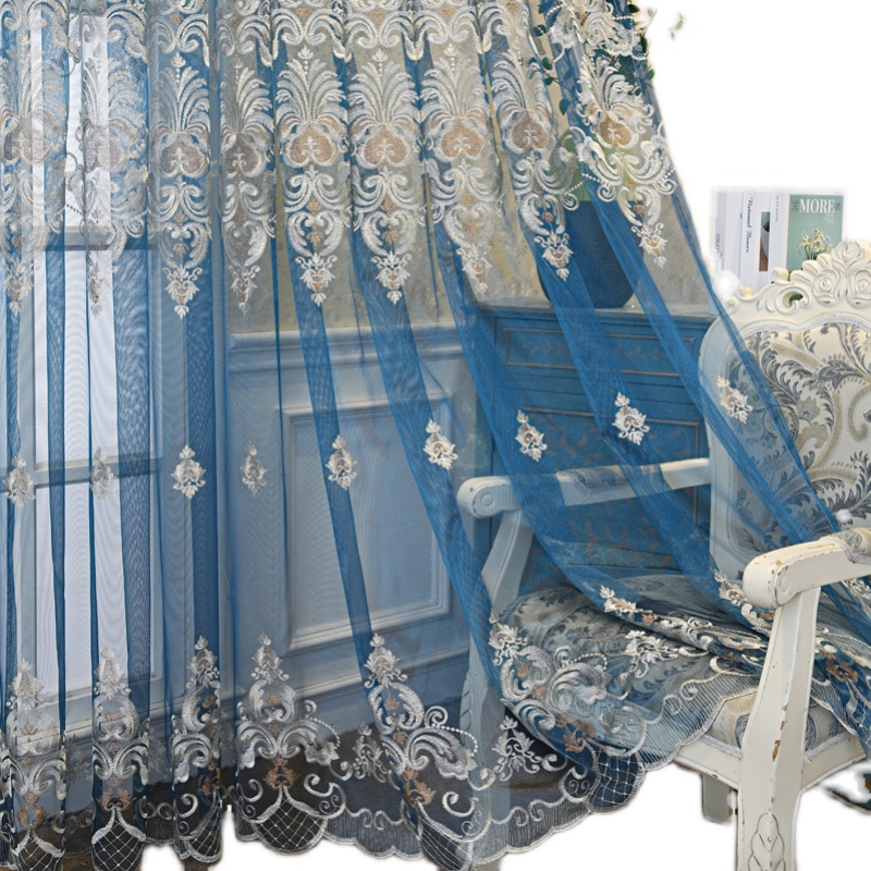 欧式蓝色绣花窗帘纱阳台卧室隔断定制H客厅纱帘别墅大气成品飘窗